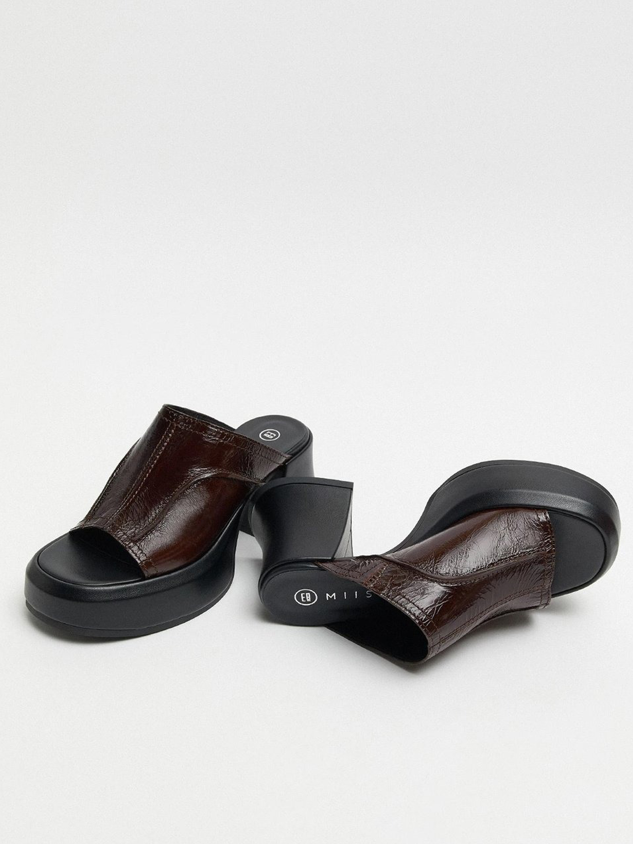 Brown leather Lota sandals by Miista with opening at the toe, a band with visible stitching and an 80mm wide heel.