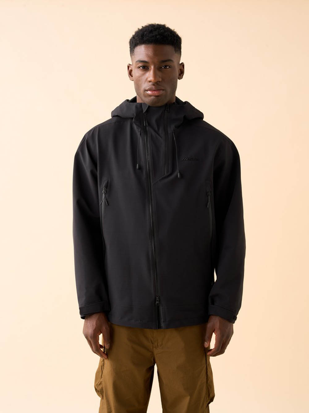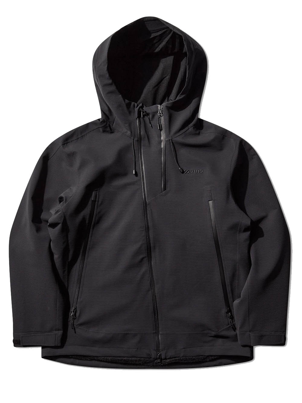 Black Tech Termal Mesh Jacket by Mizuno in polyester with drawstring hood, front zip closure, and side pockets.