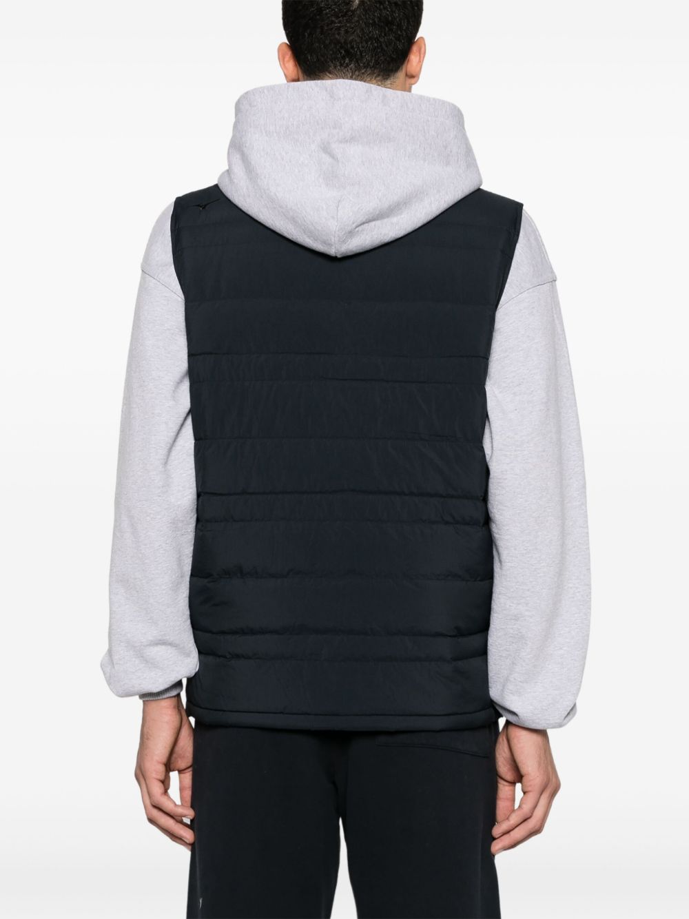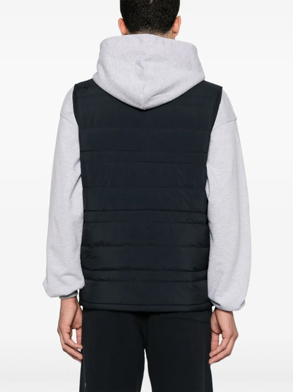 Gilet nero Lightweight di Mizuno con mbottitura in piuma d'oca, design imbottito, design trapuntato, chiusura frontale con abbottonatura a pressione, design senza colletto, senza maniche, due tasche laterali a filetto, fodera integrale e orlo dritto.