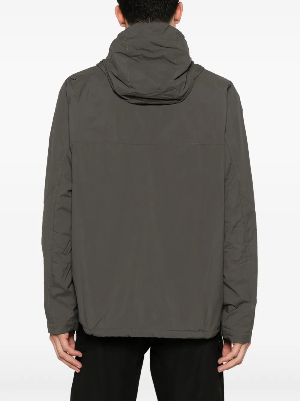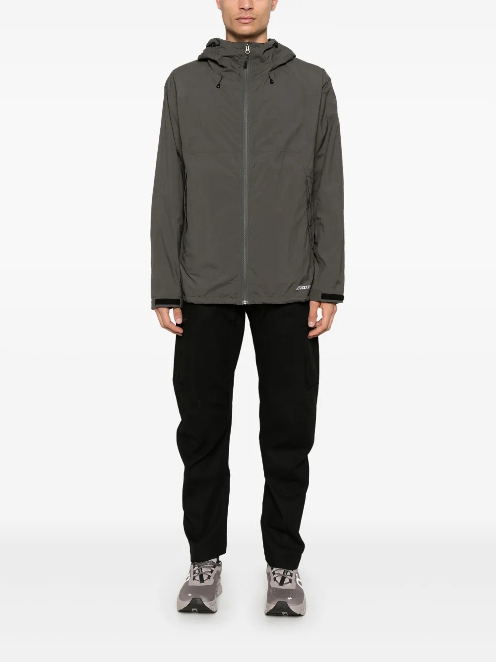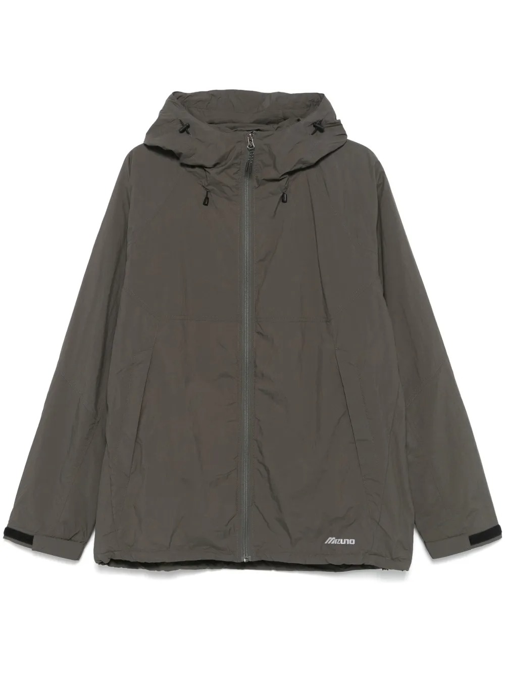Mizuno BT Thermal Mesh hoody jacket in ash black with front zip closure, waterproof, raised collar, drawstring hood, long raglan sleeves, hook-and-loop cuffs, two side pockets with zips, logo print on the front, full lining, and drawstring hem.