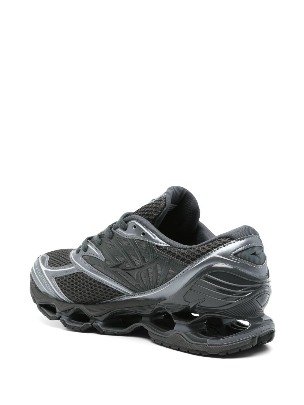 Mizuno's gray SL Wave Prophecy LS suede sneakers with round toe, front lace-up closure, side logo, leather inserts, and 4 cm high rubber sole.
