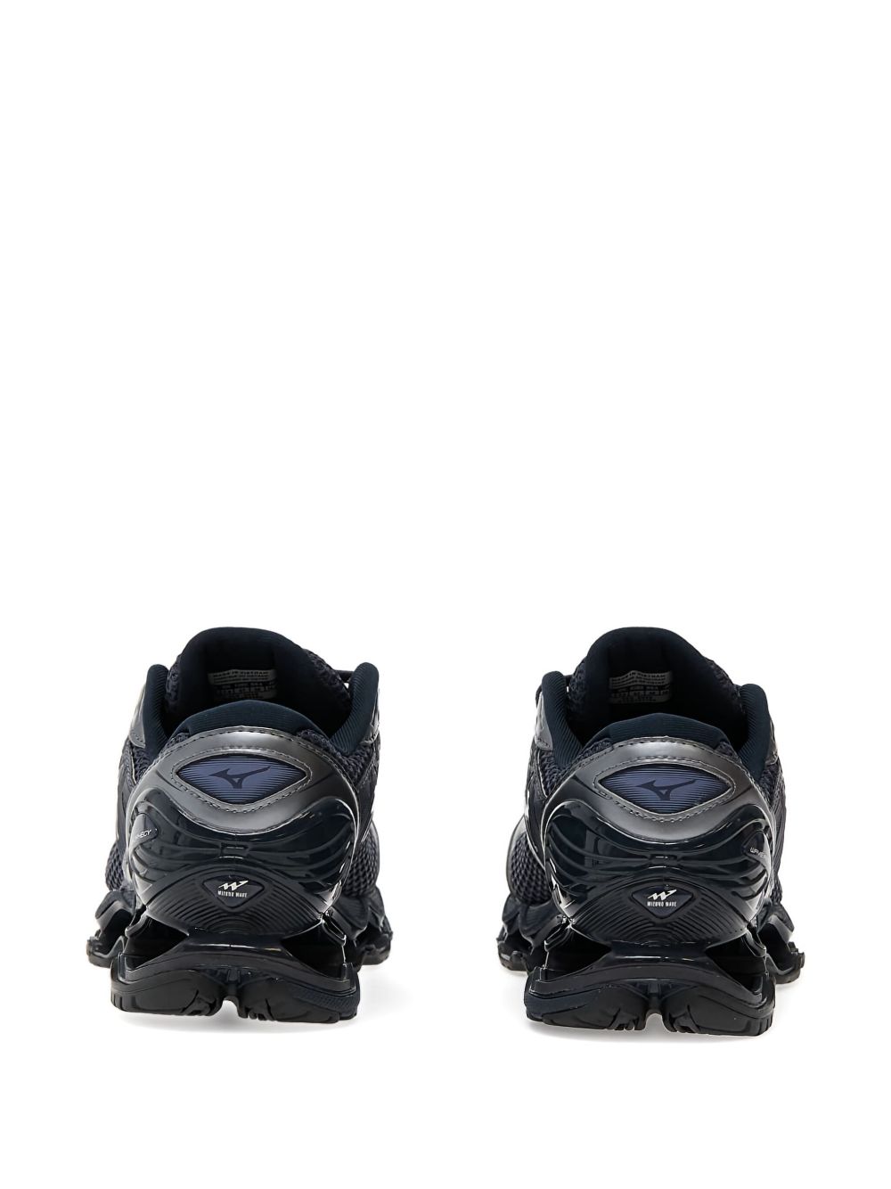 Mizuno's gray SL Wave Prophecy LS suede sneakers with round toe, front lace-up closure, side logo, leather inserts, and 4 cm high rubber sole.