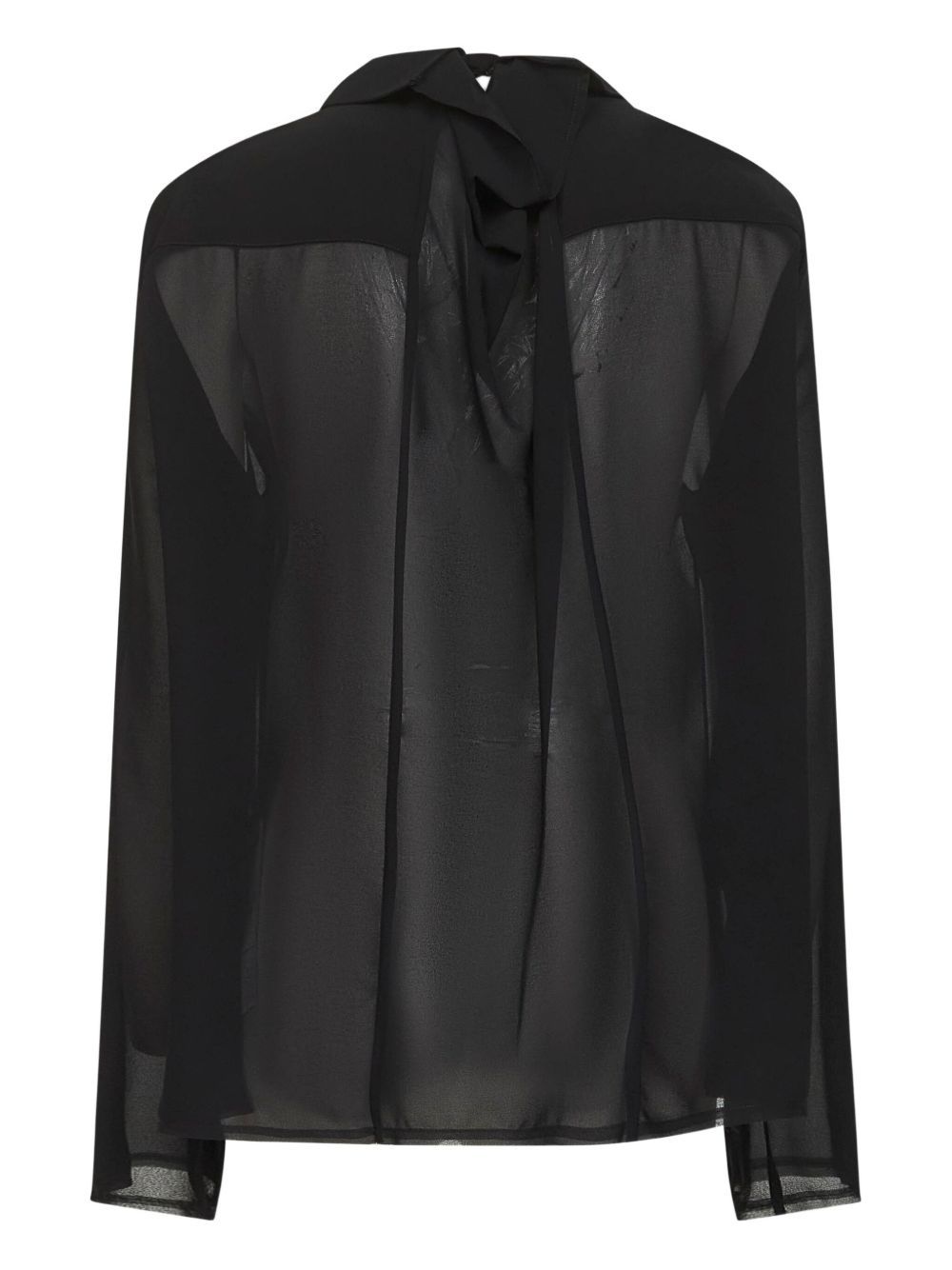 Black polyester shirt by MM6 Maison Margiela with asymmetrical collar, ruffle detail on the back, long sleeves, and buttoned placket.