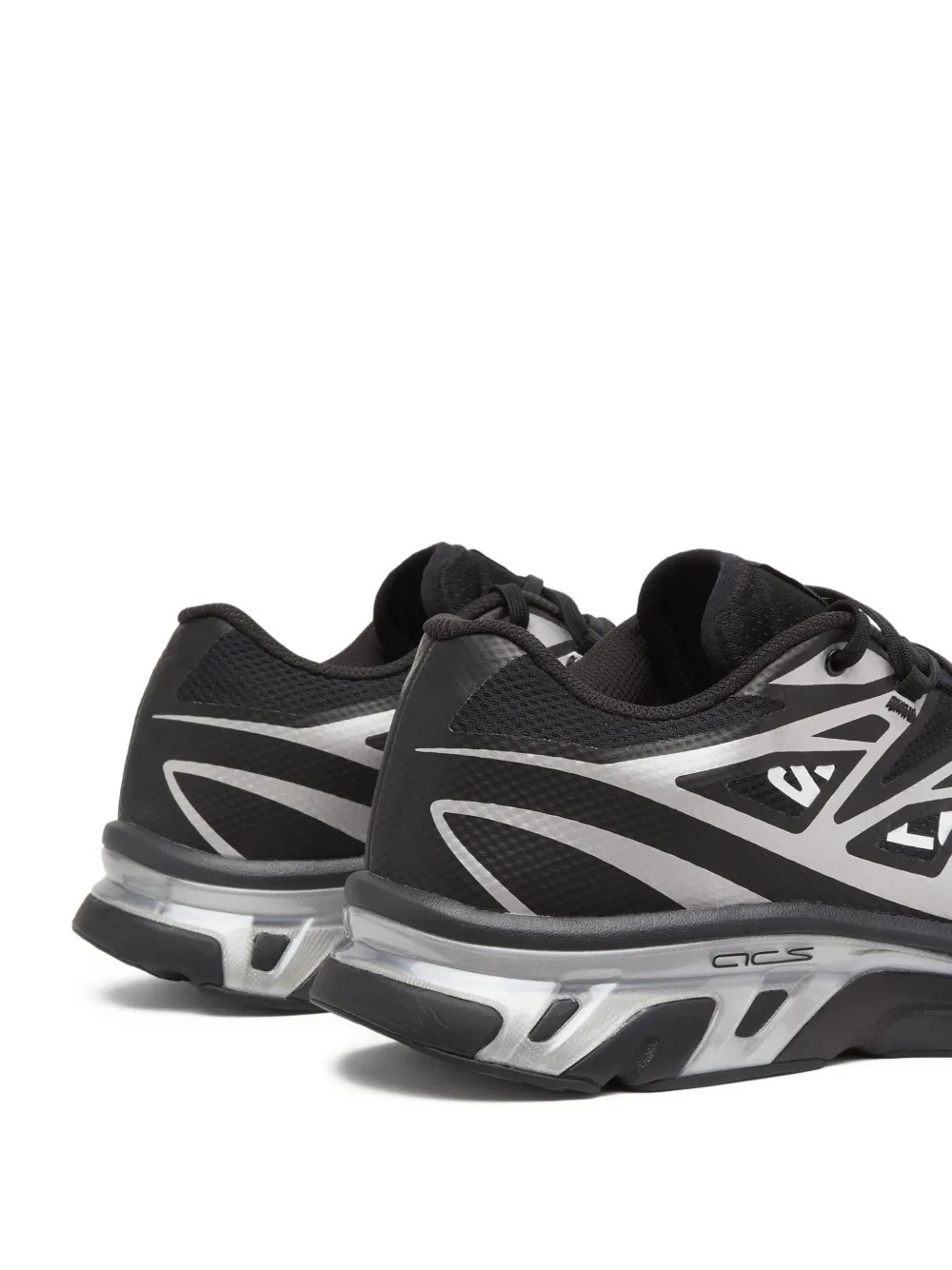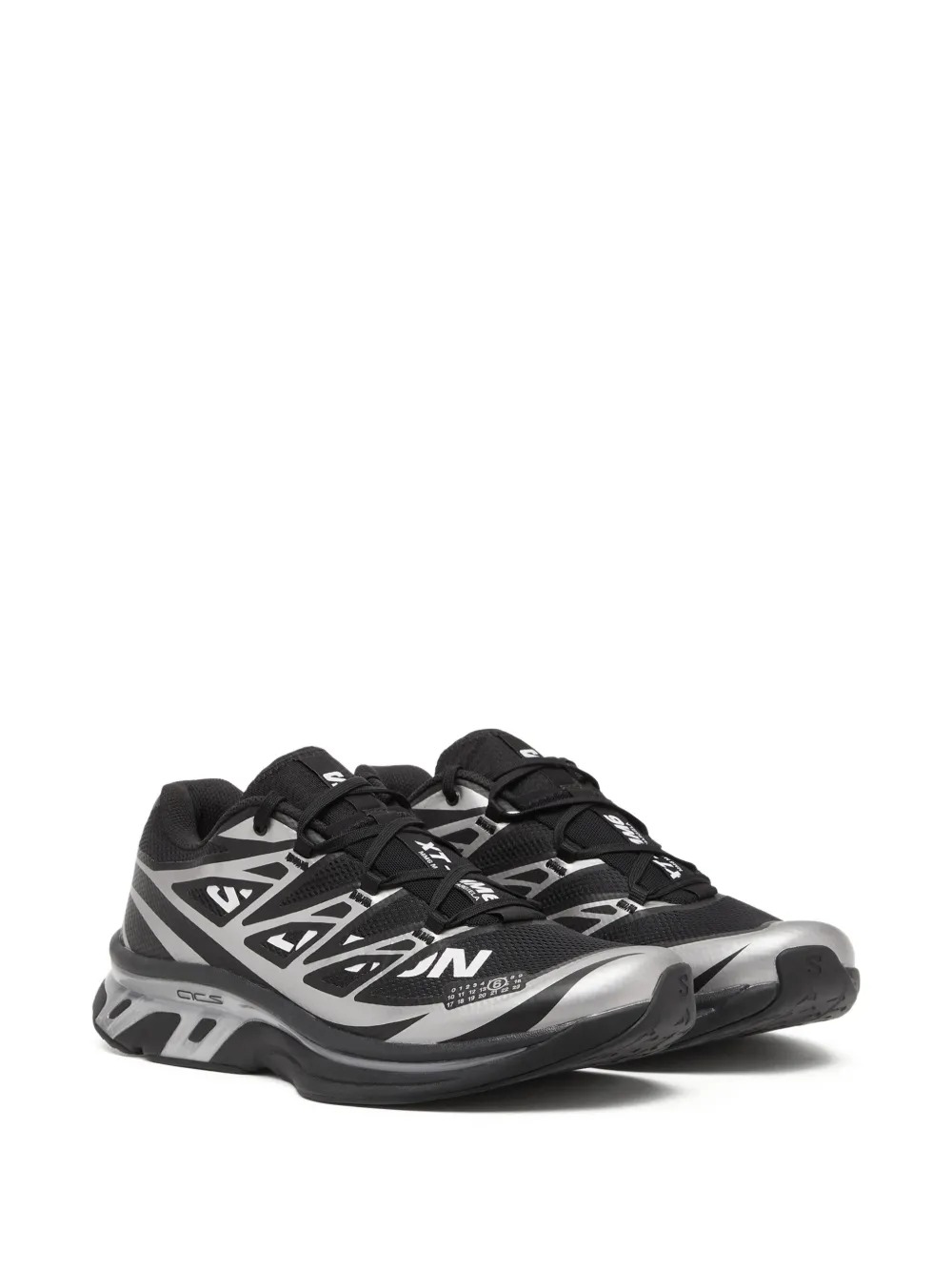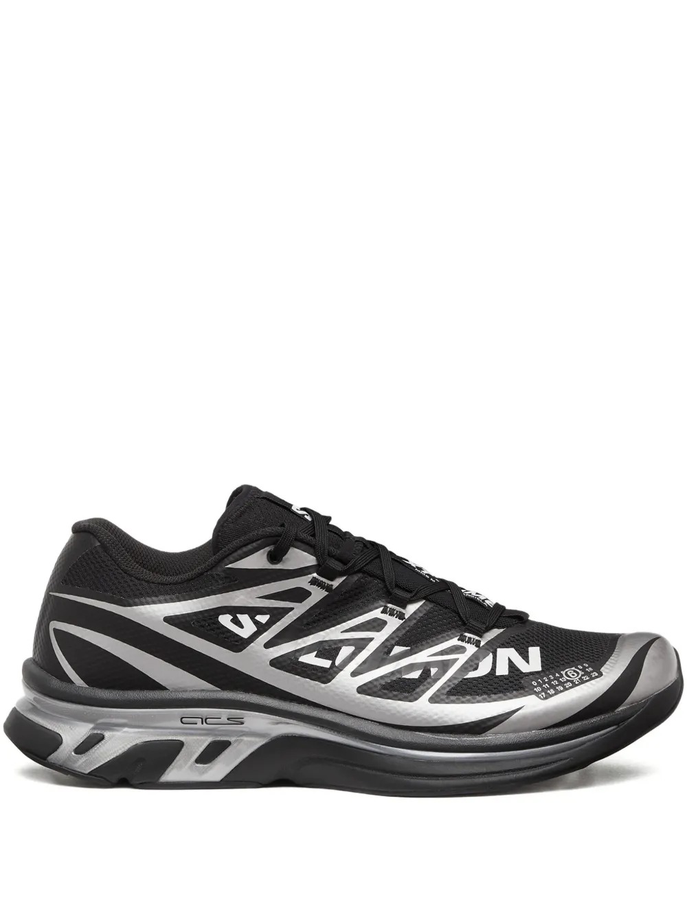 MM6 Maison Margiela Salomon XT-6 black sneakers in fabric with heat-sealed details, a drawstring closure, a round toe, fabric linings, and a textured rubber outsole. The design is completed by the logo label on the tongue and the printed logo on the side.