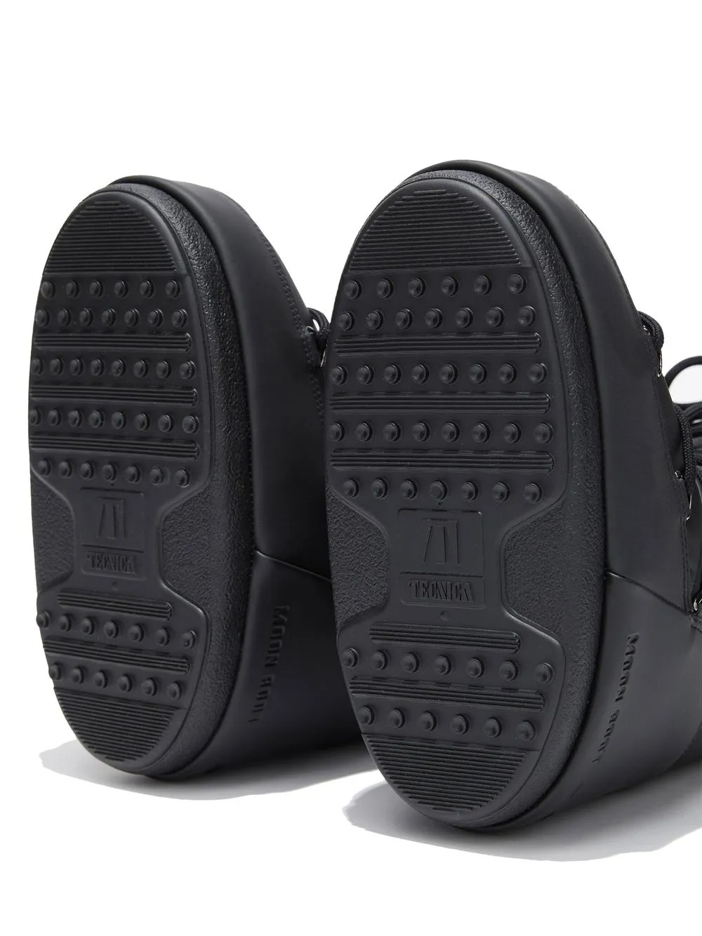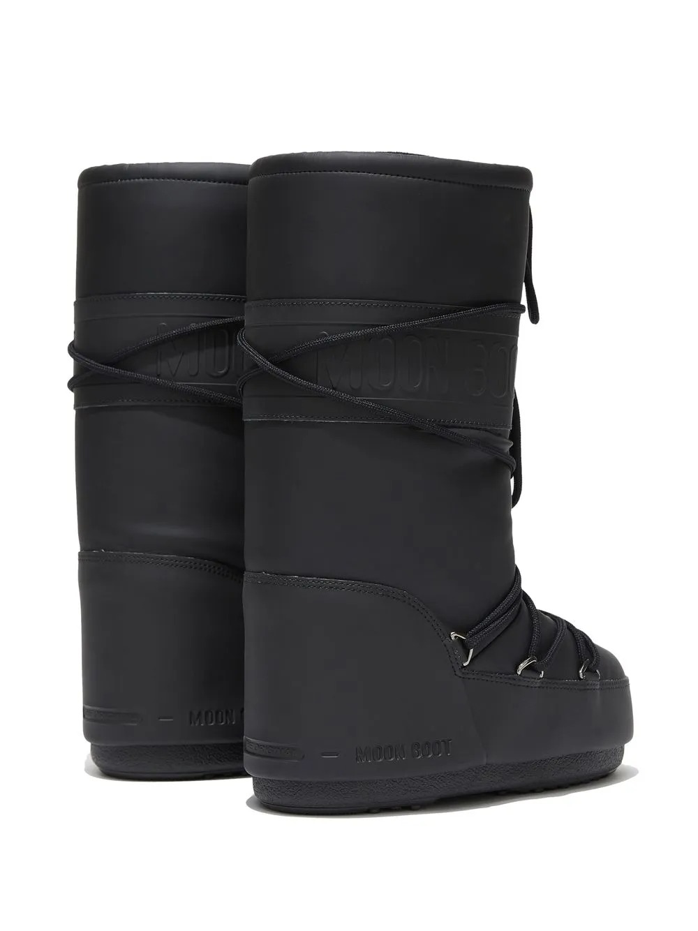 Black women's Icon boots by Moon Boot with round toe, drawstring top closure, slip-on and padded design, 100% water repellent, logo detail and flat sole.
