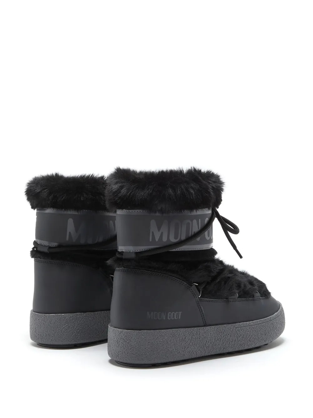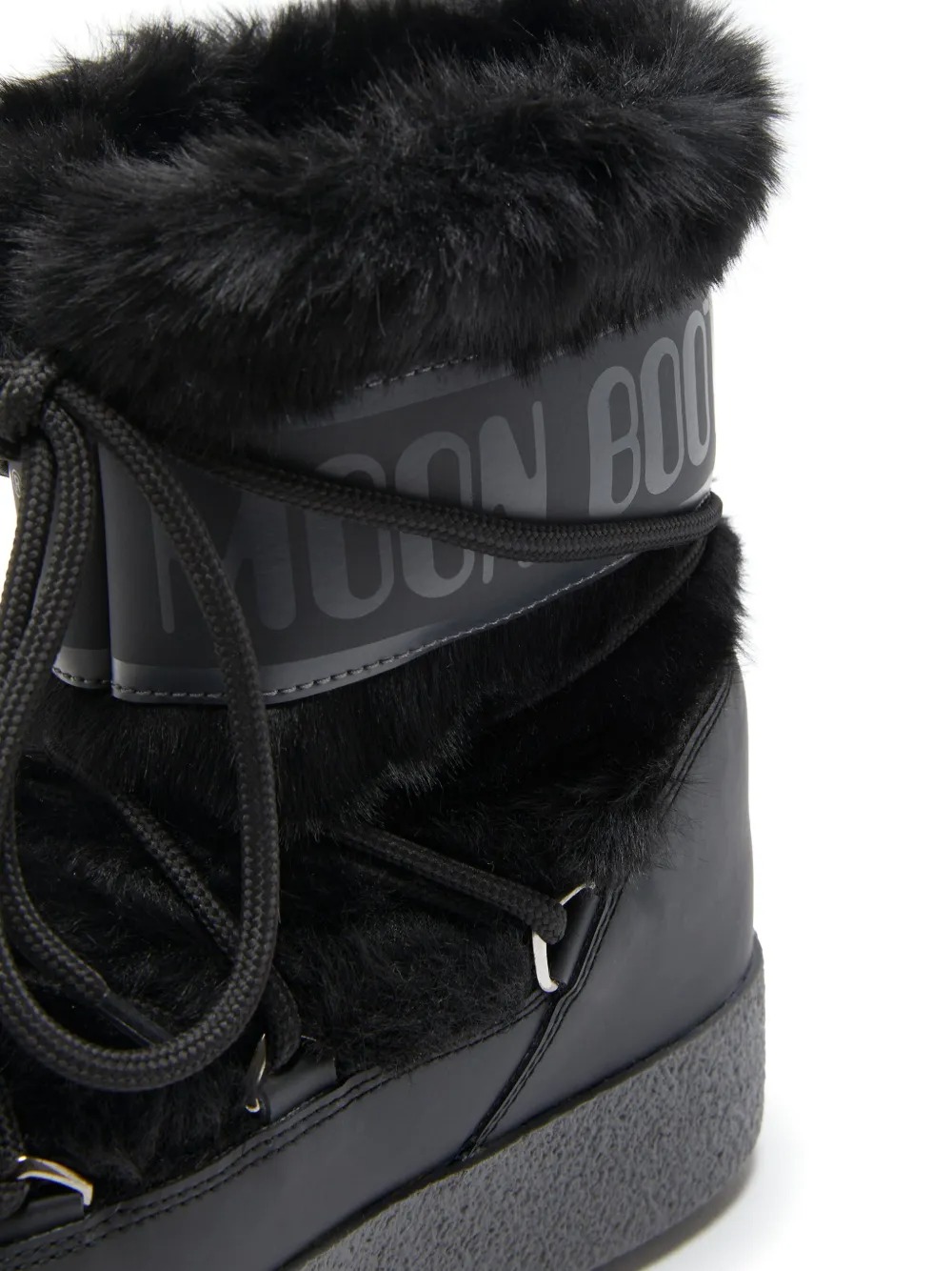 Moon Boot Itrack Faux Fur Wp women's black boots with round toe, drawstring closure at the top, slip-on design and padding, logo detail, and flat sole.