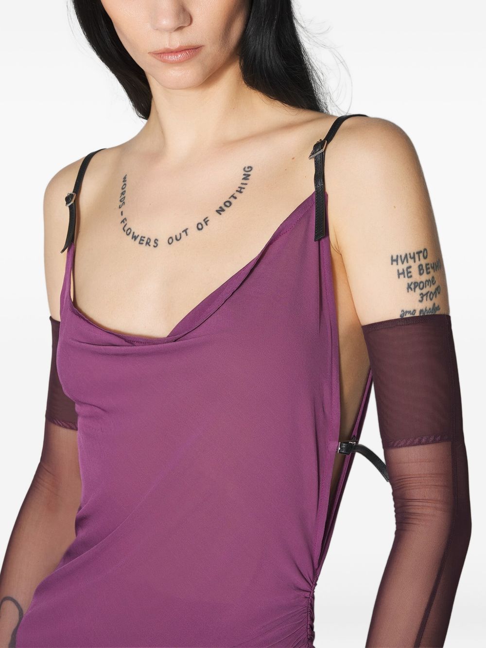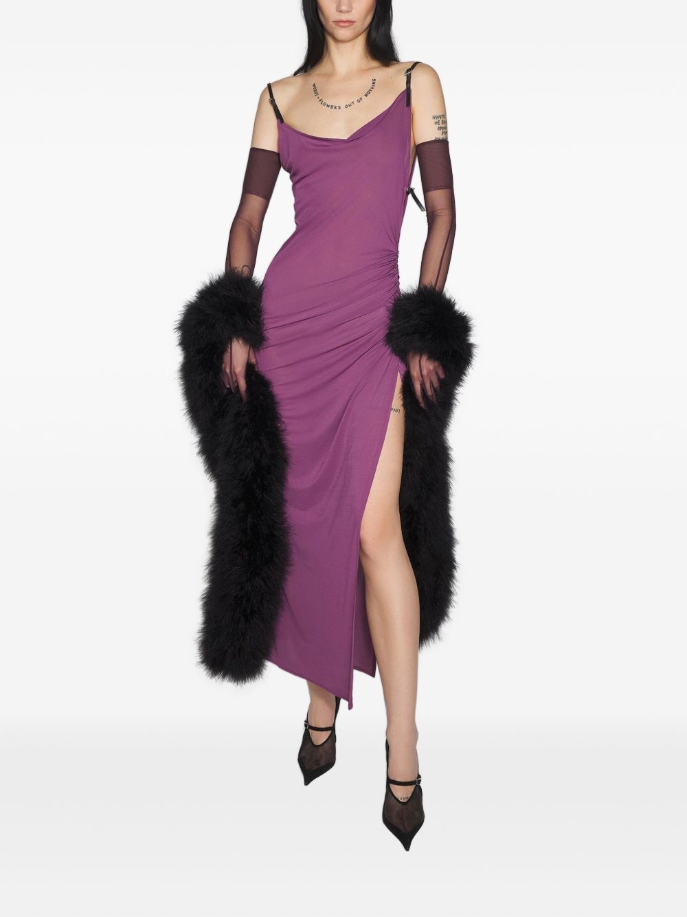 Asymmetric pink dress by Mugler in viscose with asymmetrical neckline, side slit, and adjustable straps.