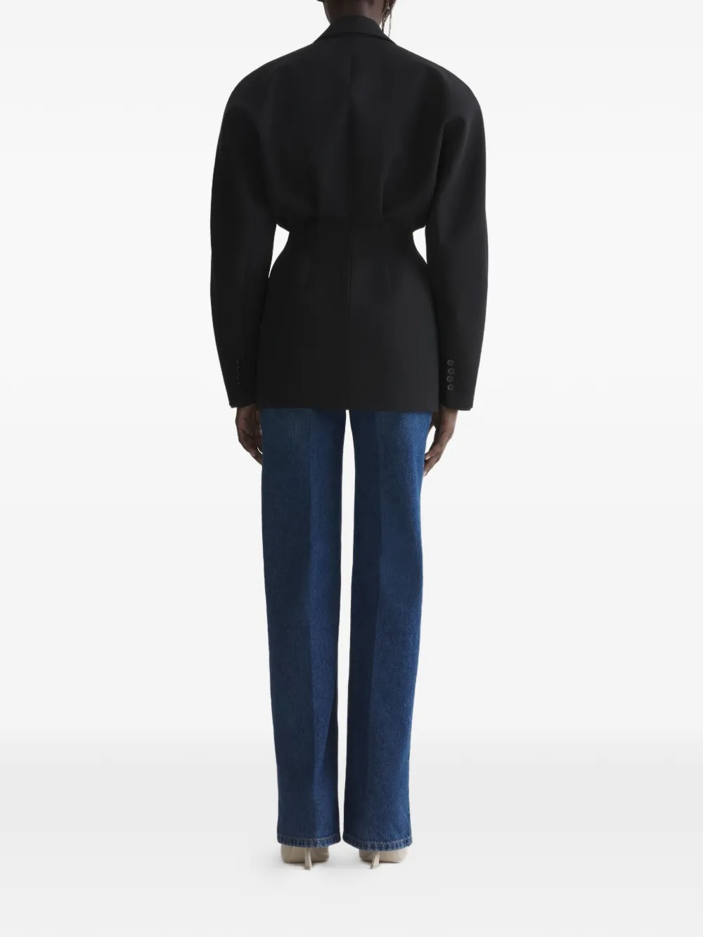 Black Cinched jacket by Mugler in cupro with padded shoulders, side slits, front button closure, long sleeves, and welt pockets.