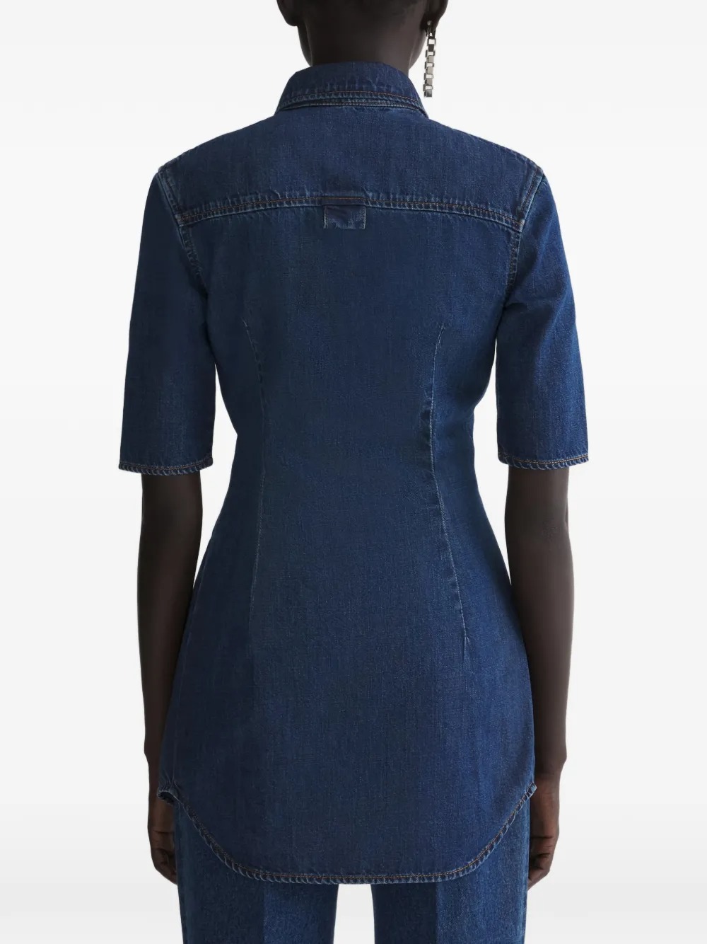 Mugler blue fitted denim shirt in cotton with button closure, short sleeves, pointed collar, insert design, and slim fit.