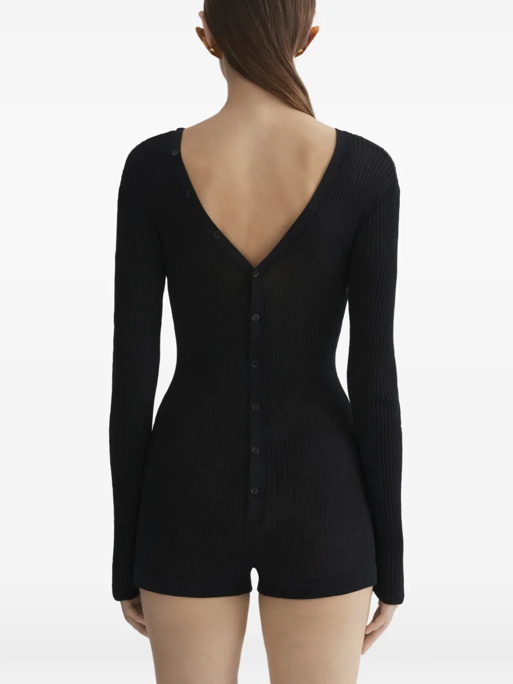 Black Mugler bodysuit in cotton with ribbed design, V-neckline, button closure, and long sleeves.