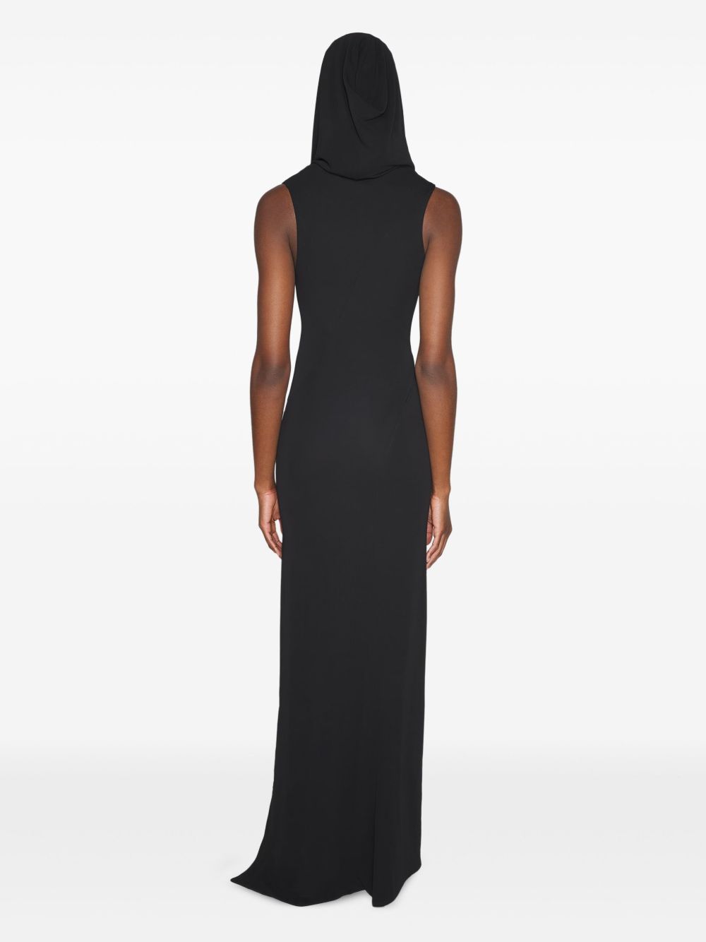 Long black Robe di Mugler dress in fabric with hooded neckline, sleeveless, zip detail and logo, and side slit.
