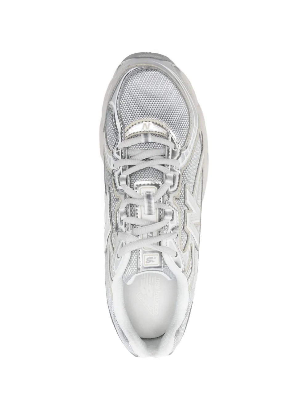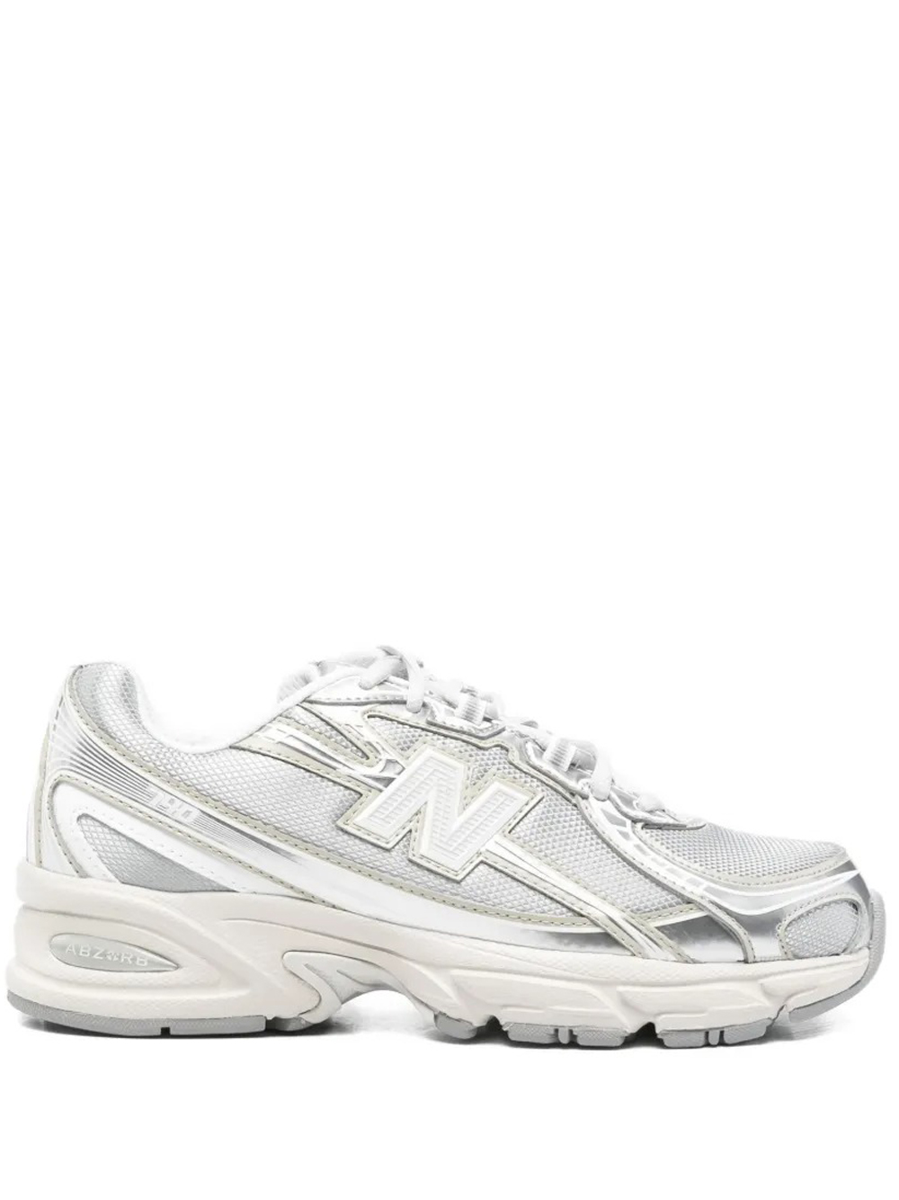 New Balance 740 silver sneakers made of polyester, featuring a round toe, a logo on the side, a lace-up closure, and a rubber sole.