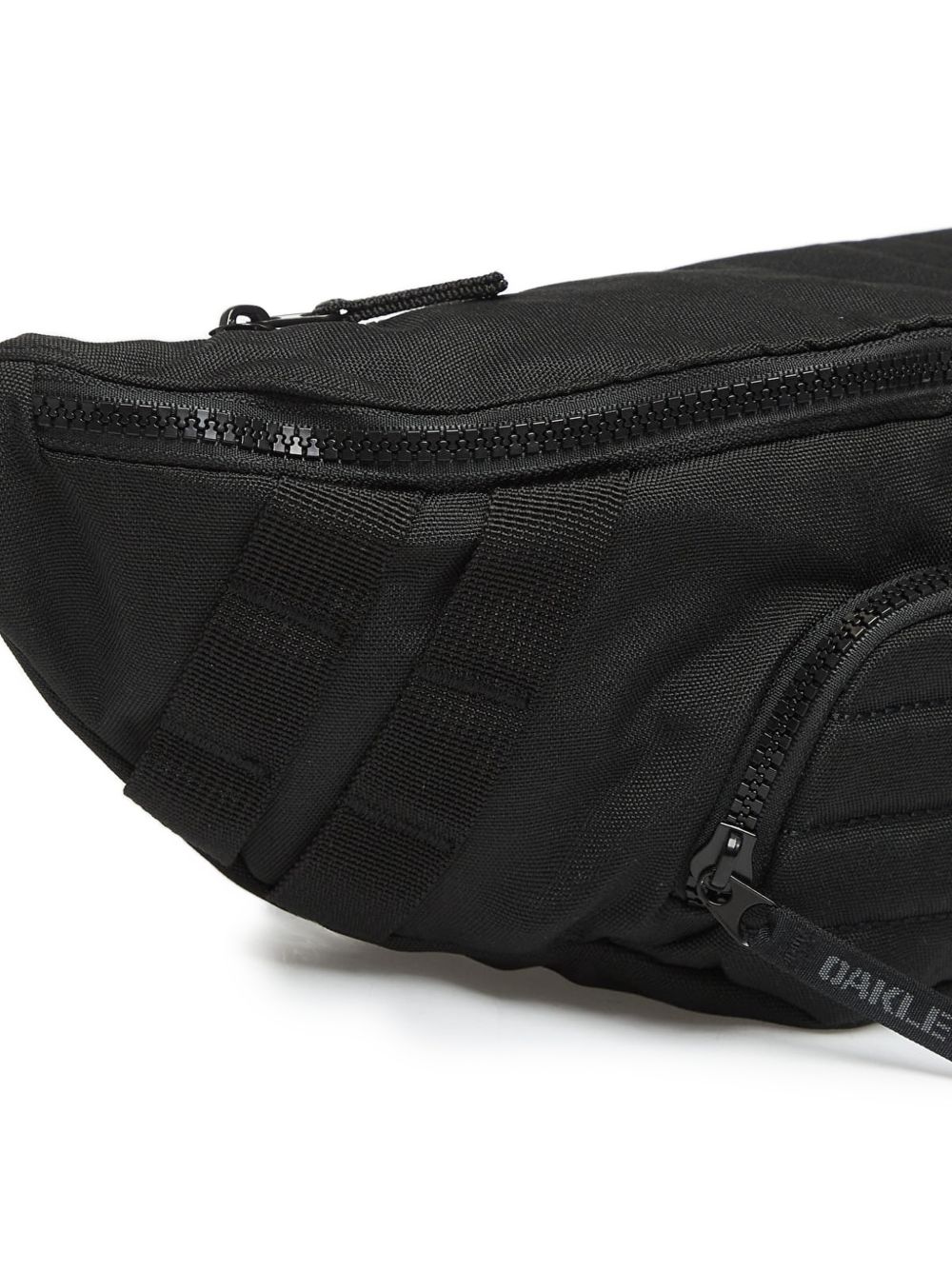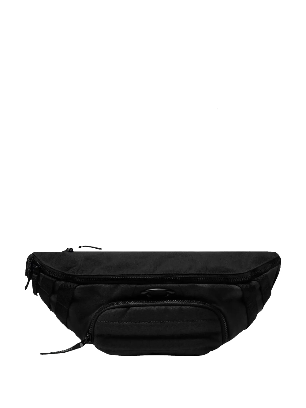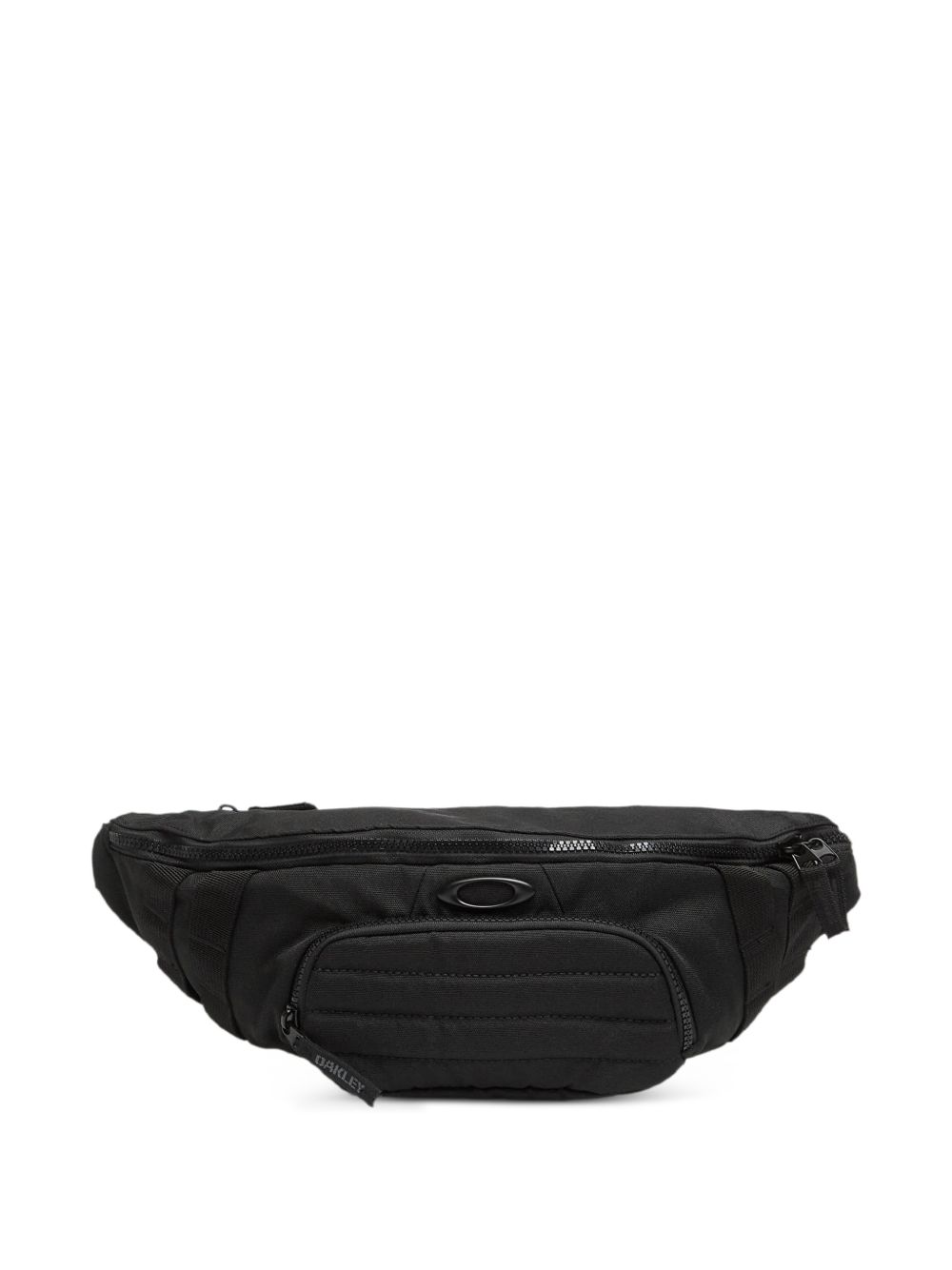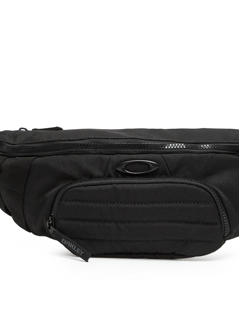 Black Oakley polyester fanny pack with a quilted panel and adjustable strap, interior pockets, and a front zippered pocket.