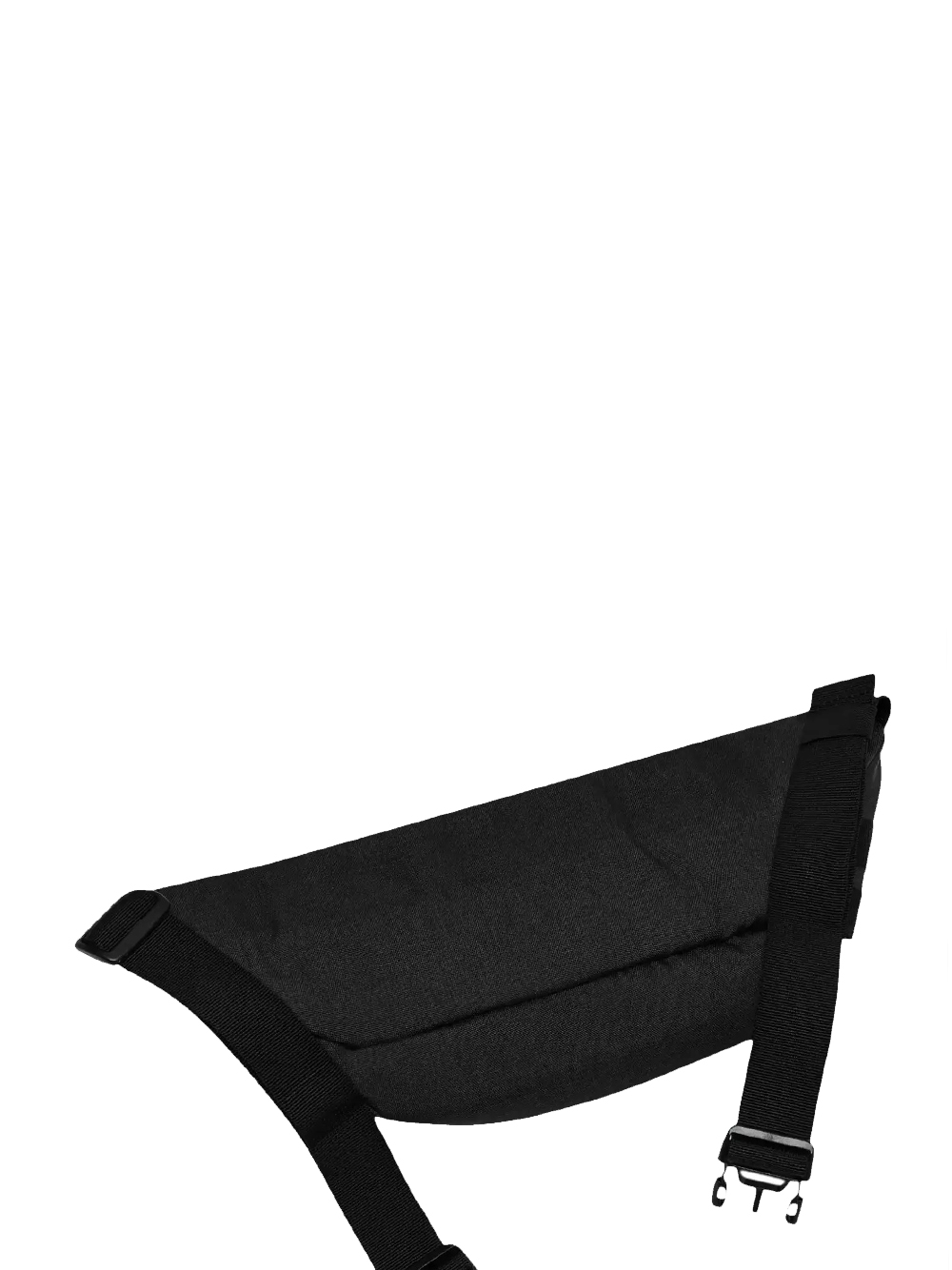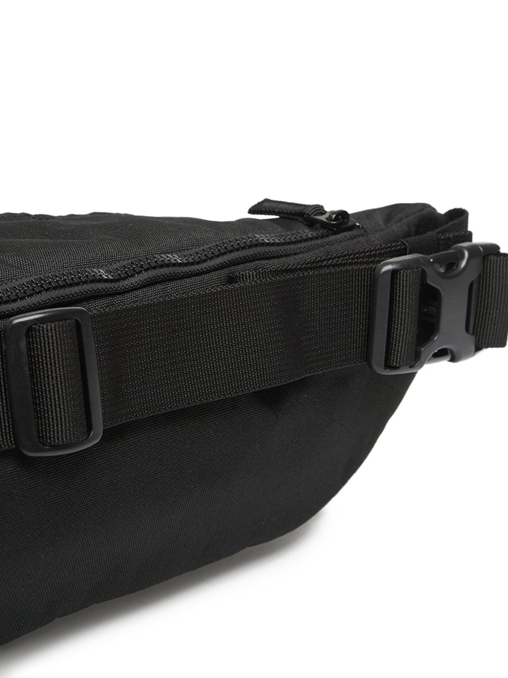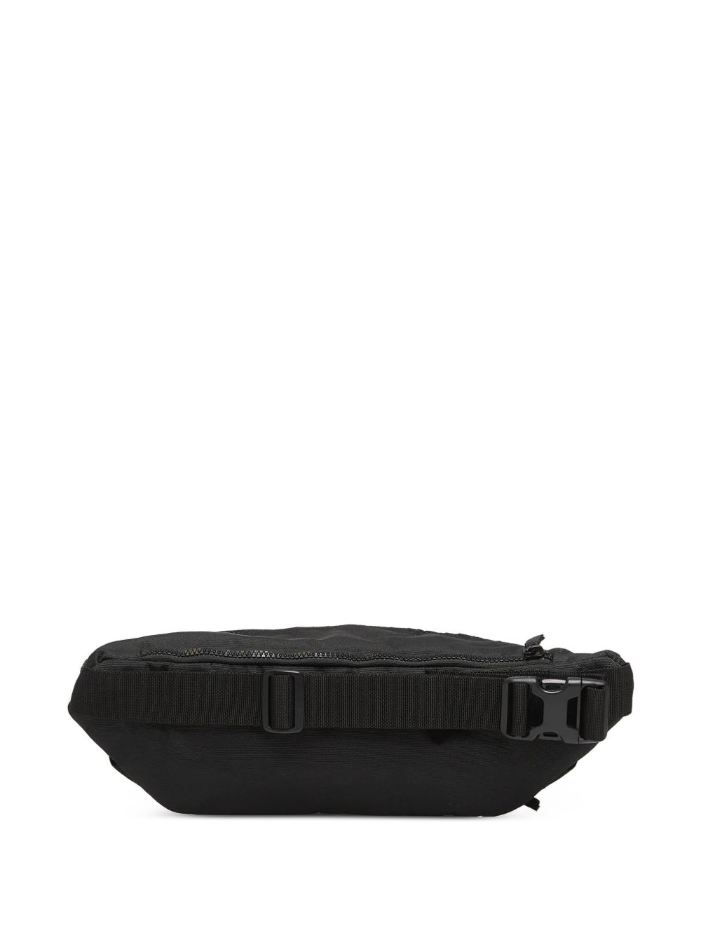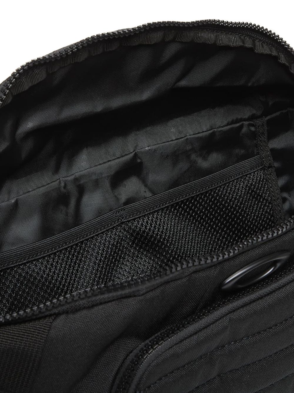 Black Oakley polyester fanny pack with a quilted panel and adjustable strap, interior pockets, and a front zippered pocket.