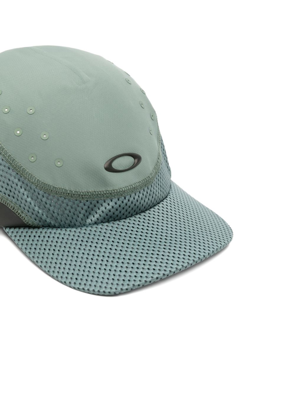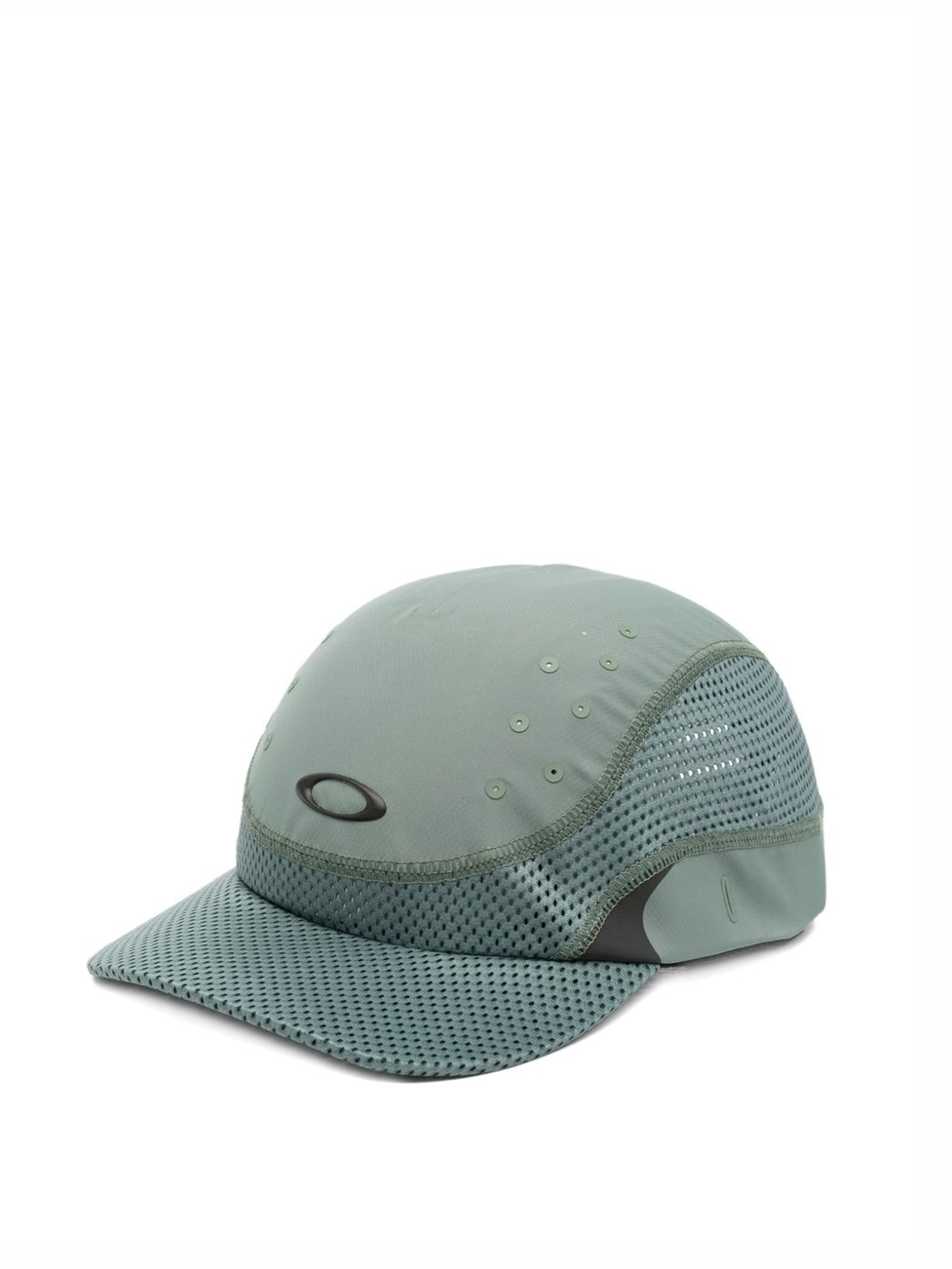 Green Oakley fabric cap with perforated details, reflective accents, a curved brim, and an adjustable design.