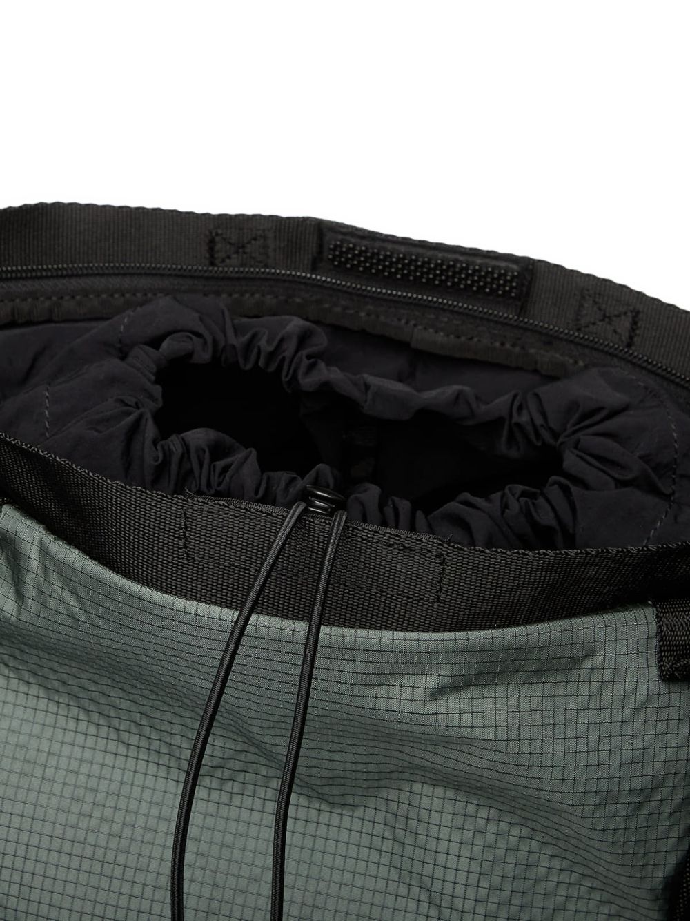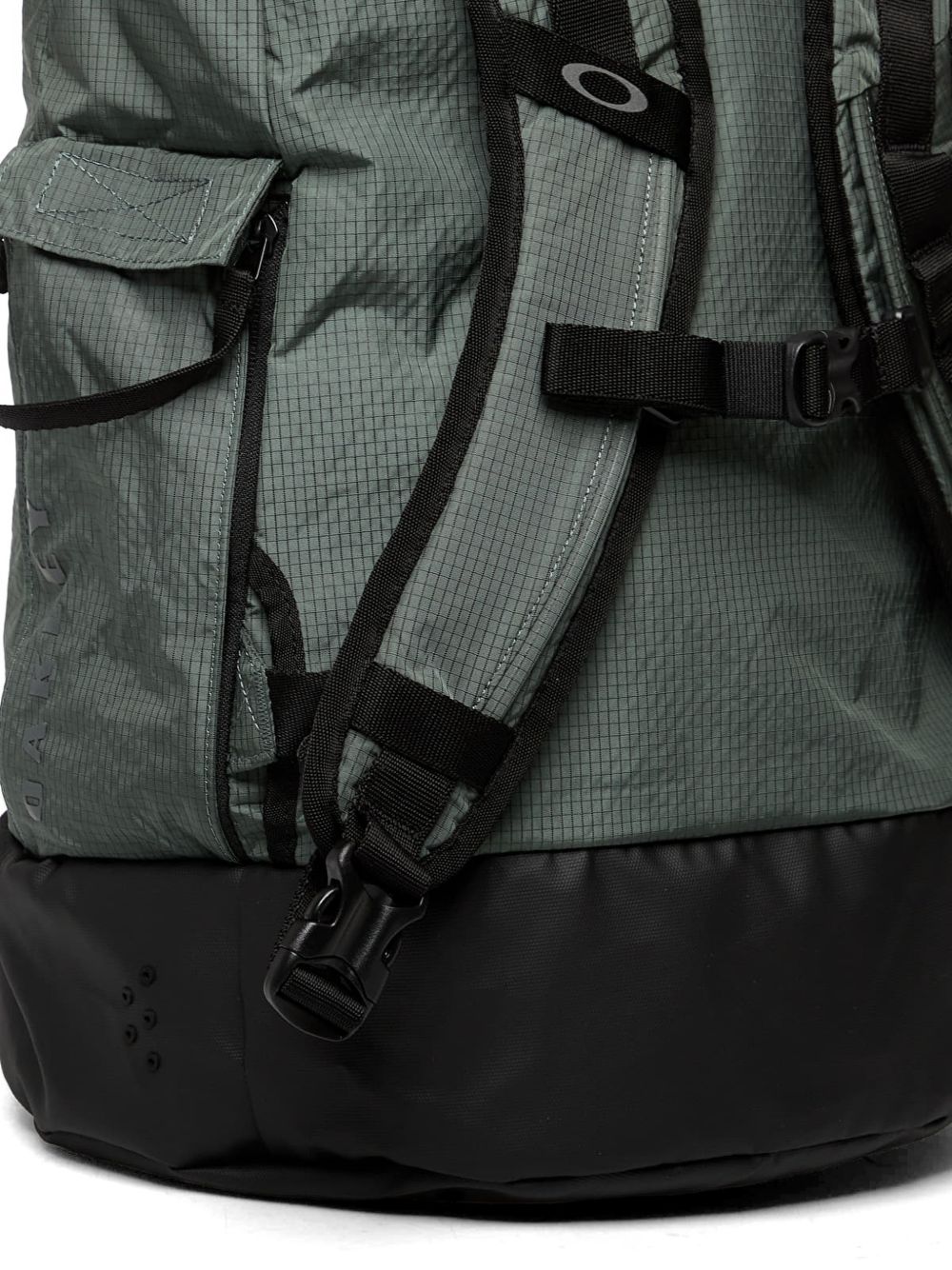 Green Oakley nylon backpack with a drawstring closure, adjustable shoulder straps, multiple external handles, adjustable straps, and pockets.