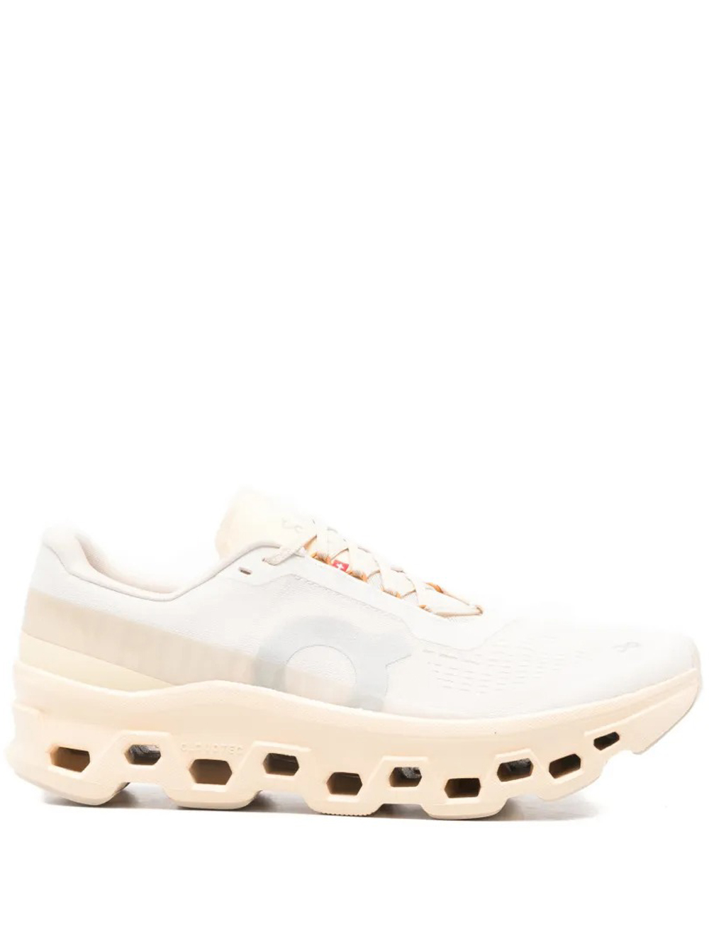 On Running Cloudmonster beige sneakers in polyester with round toe, slip-on design with laces, side logo, maximum CloudTec®, cushioning with Helion superfoam and Speedboard®.