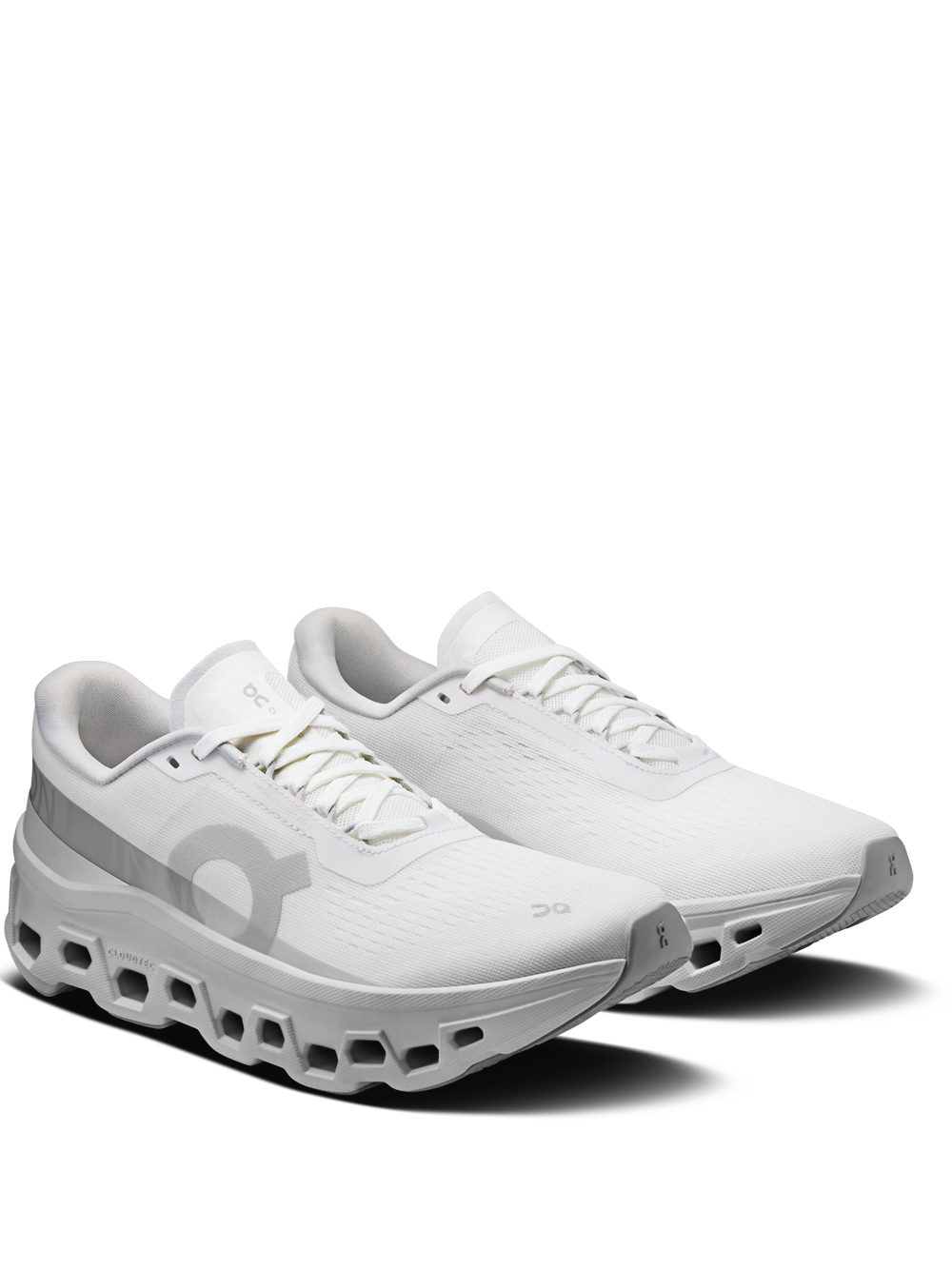 On Running Cloudmonster white sneakers in polyester with round toe, slip-on design with laces, side logo, maximum CloudTec®, cushioning with Helion superfoam and Speedboard®.