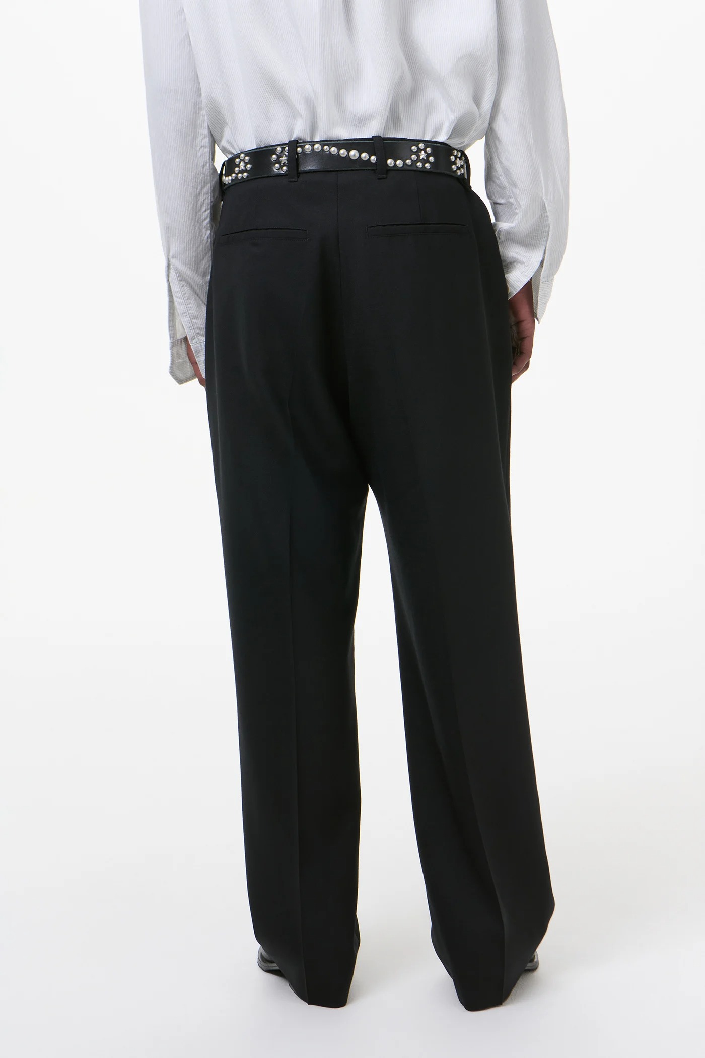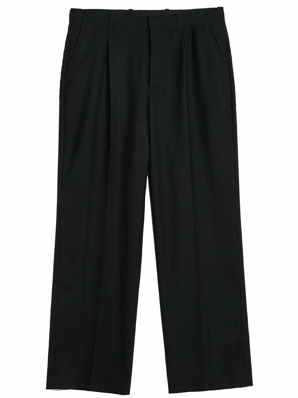 Black Borrowed Chino pants by Our Legacy in hammered wool with embroidered logo, pleated details, button detail, belt loops, eyelet and zip closure, two side pockets, and two back welt pockets.