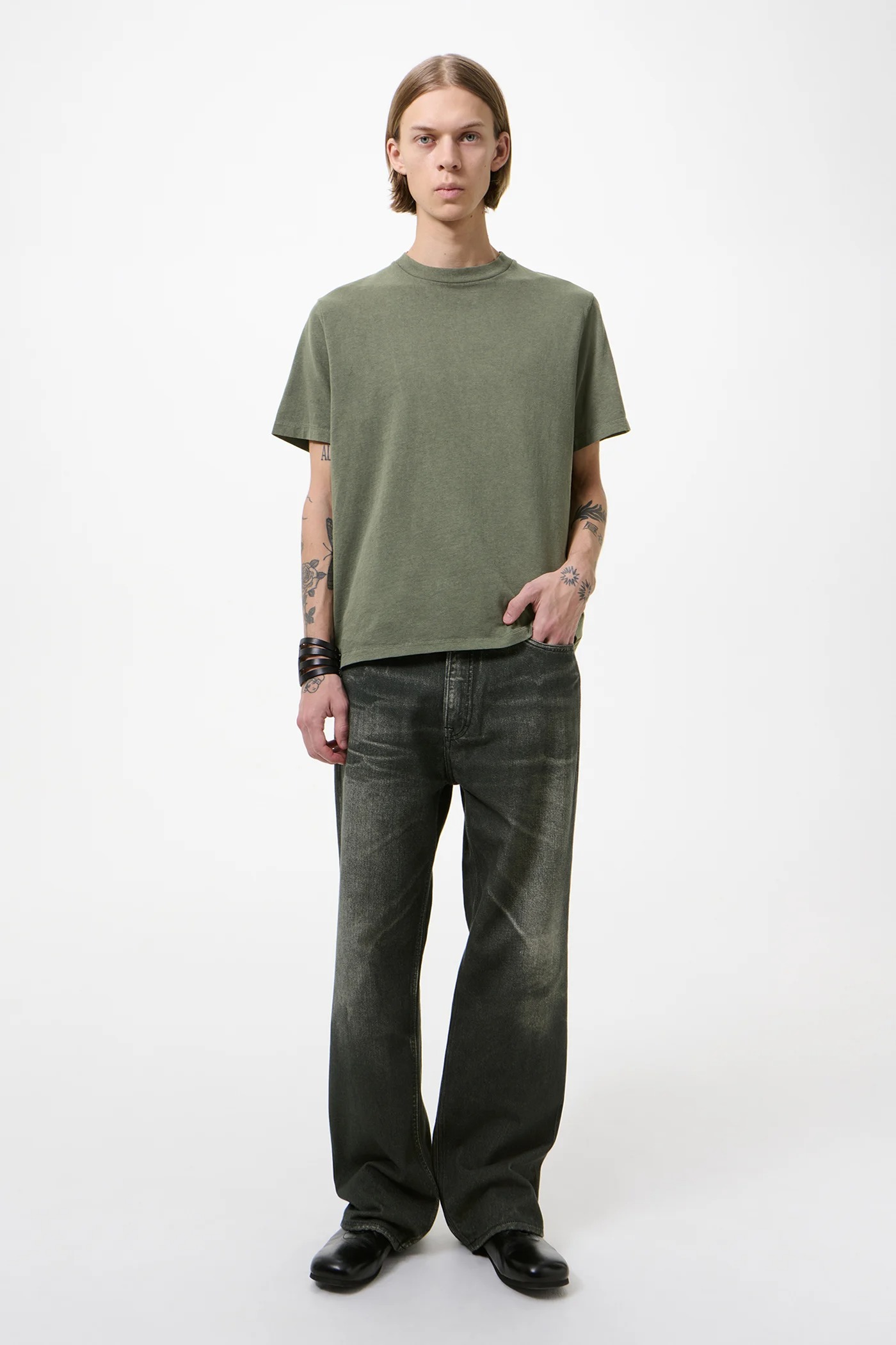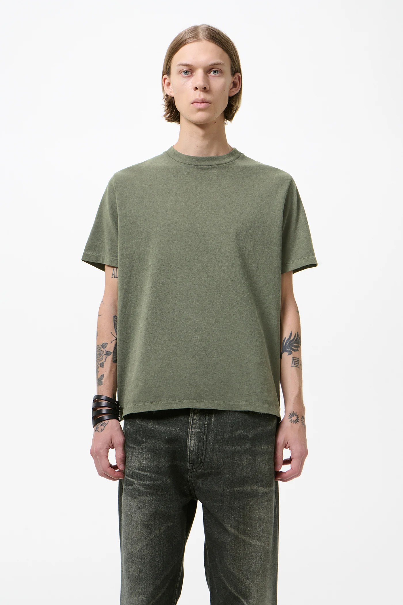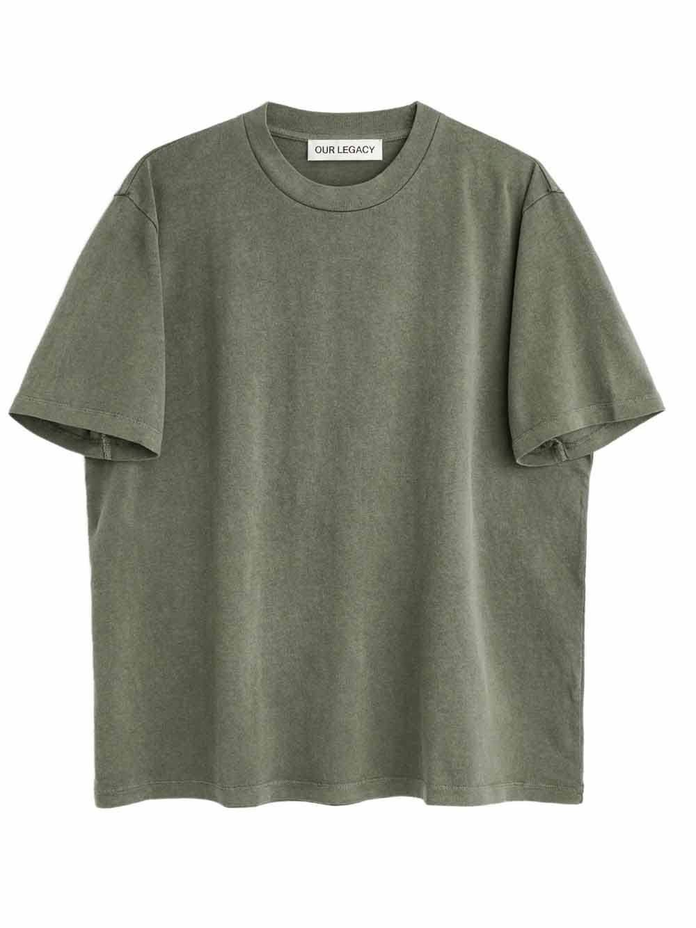 Olive cotton T-shirt by Our Legacy with crew neck, short sleeves, ribbed trim, boxy fit, and straight hem.