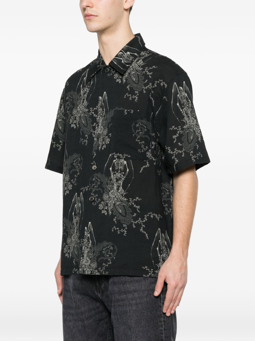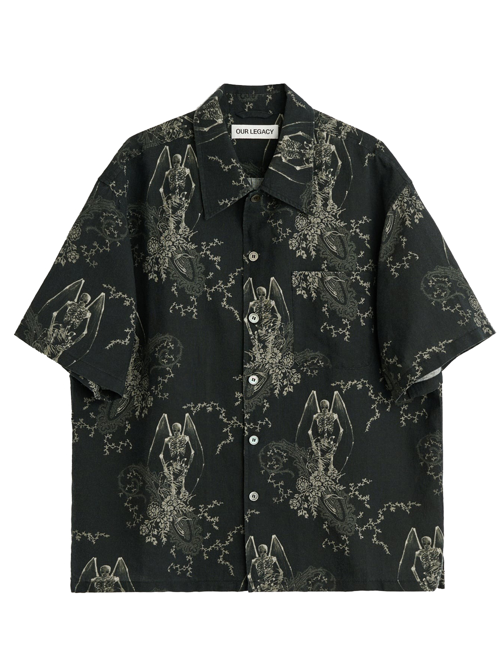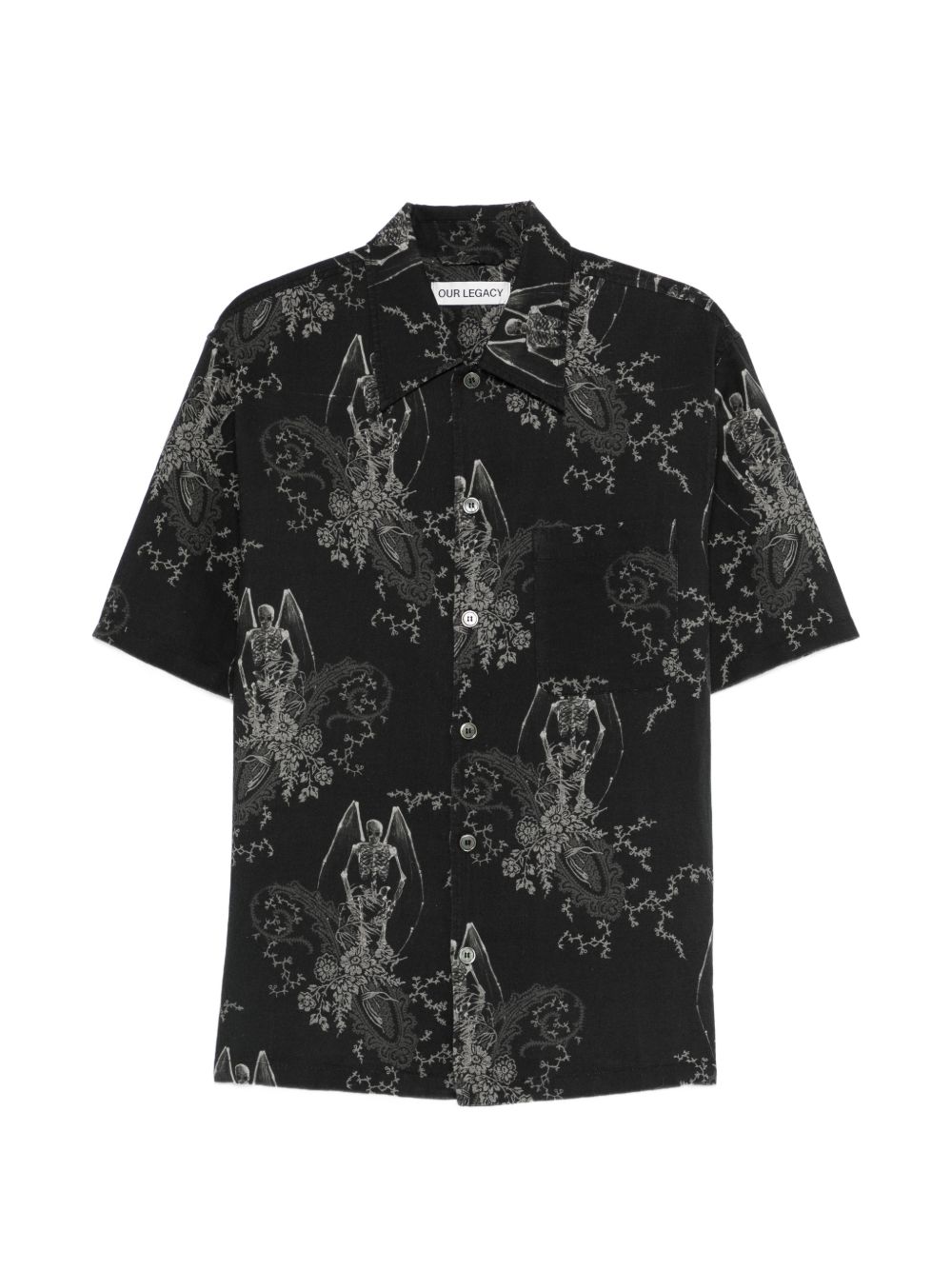 Every shirt by Our Legacy in cotton with black graphic pattern, button closure, short sleeves, pointed collar, and chest pocket.