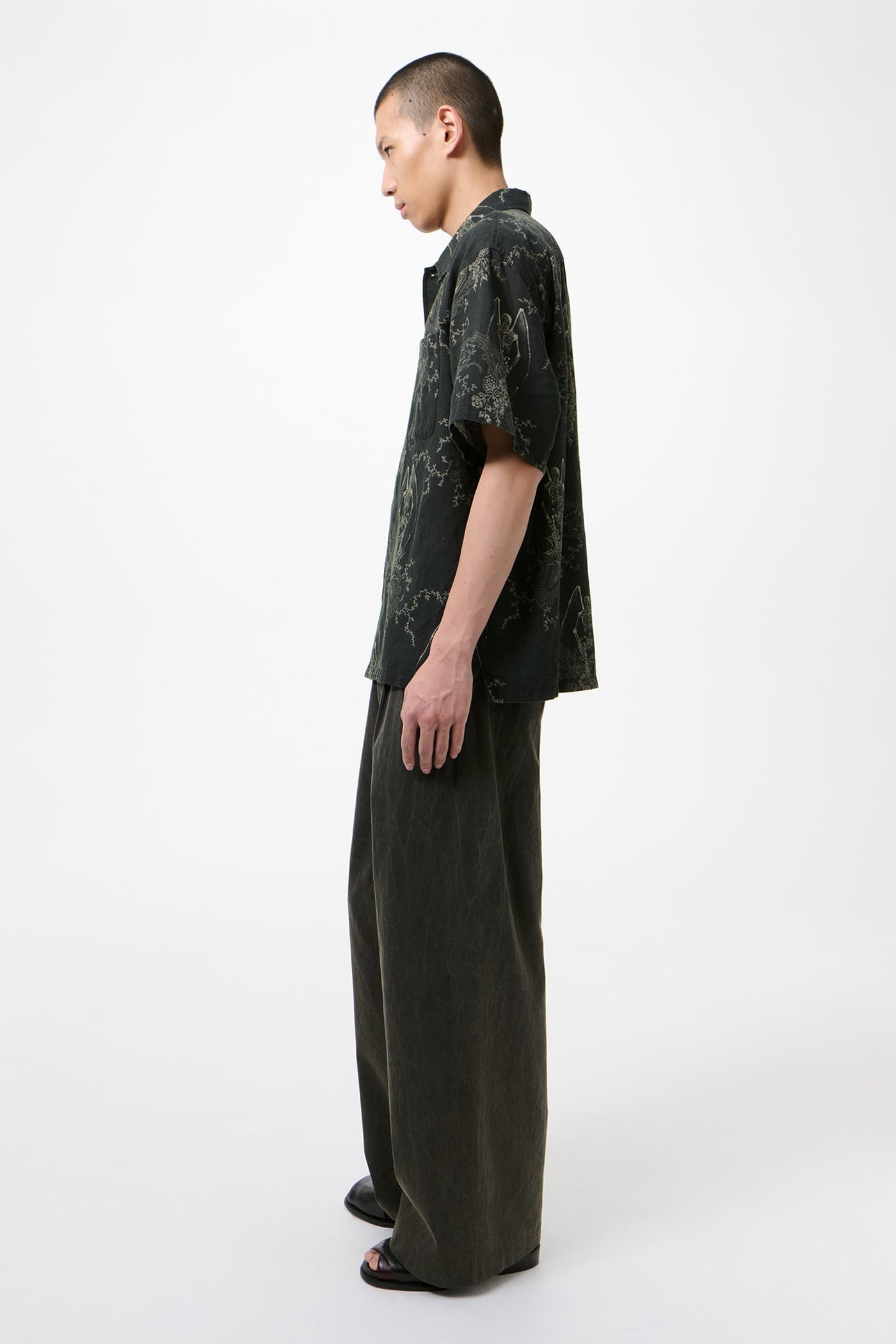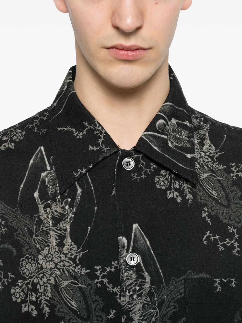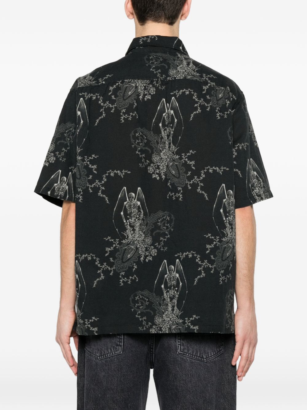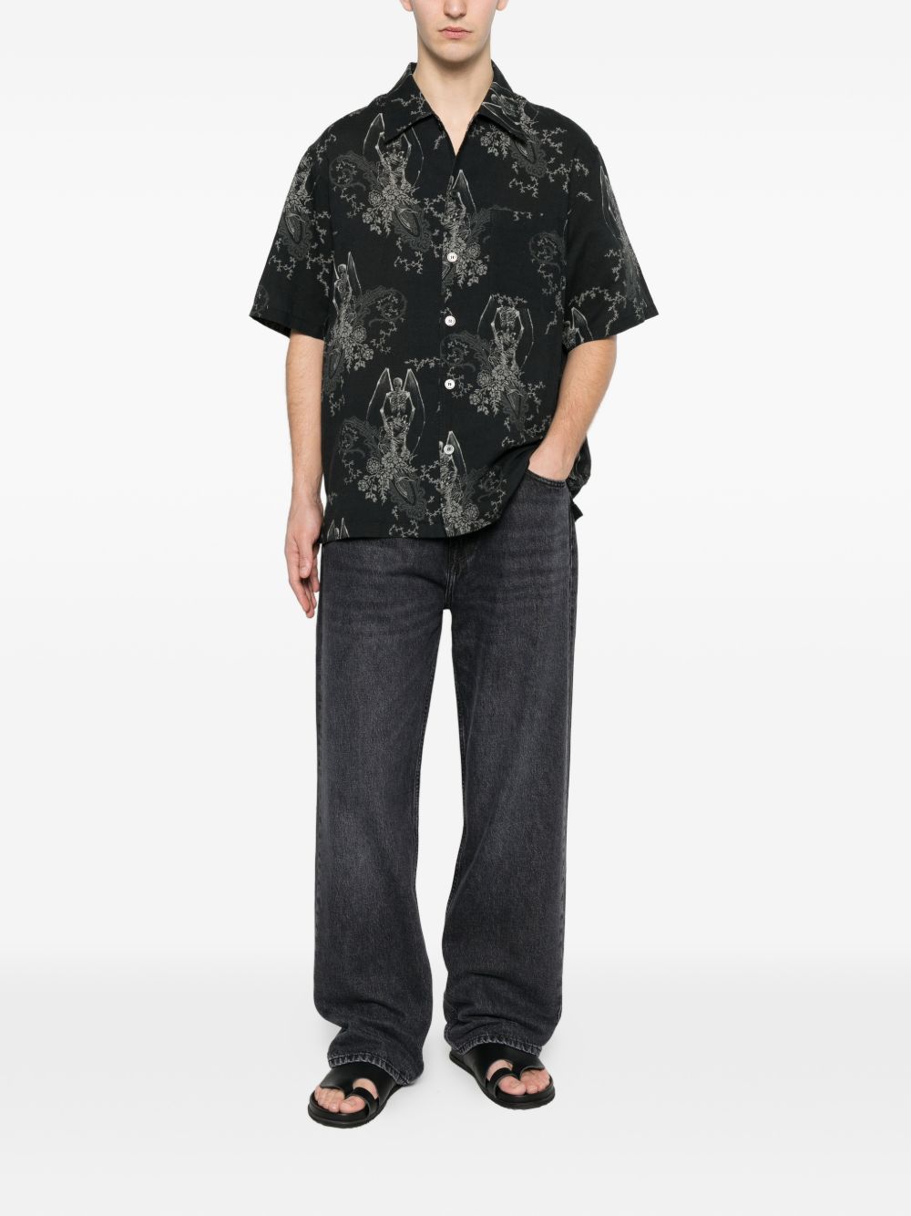 Every shirt by Our Legacy in cotton with black graphic pattern, button closure, short sleeves, pointed collar, and chest pocket.