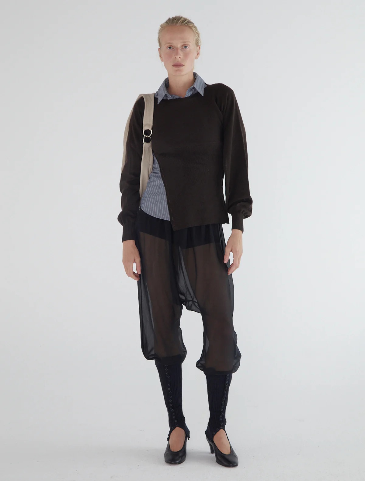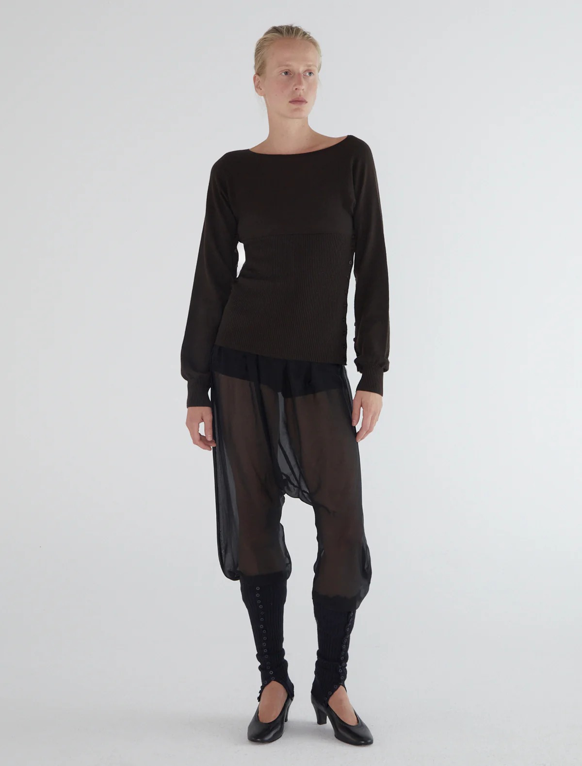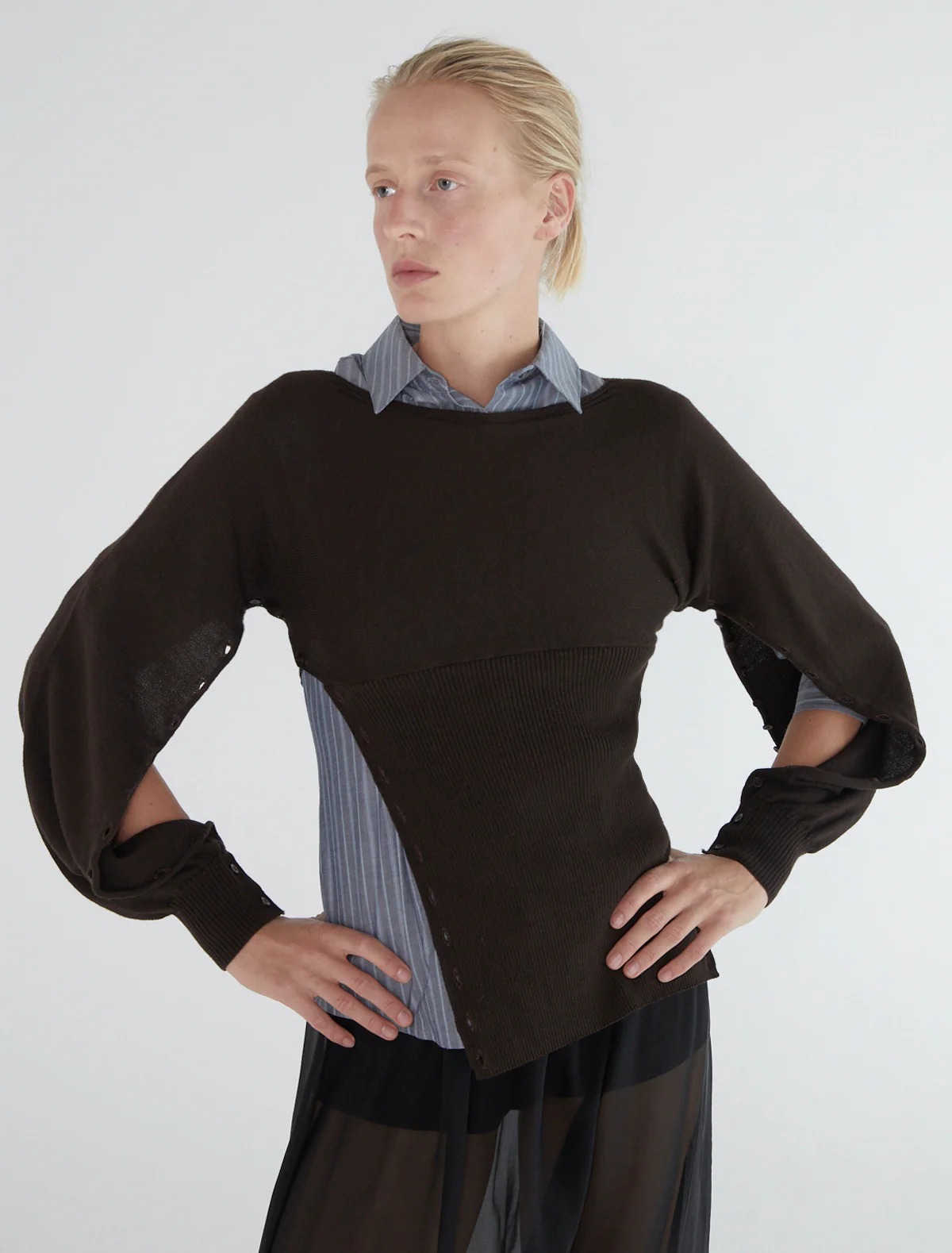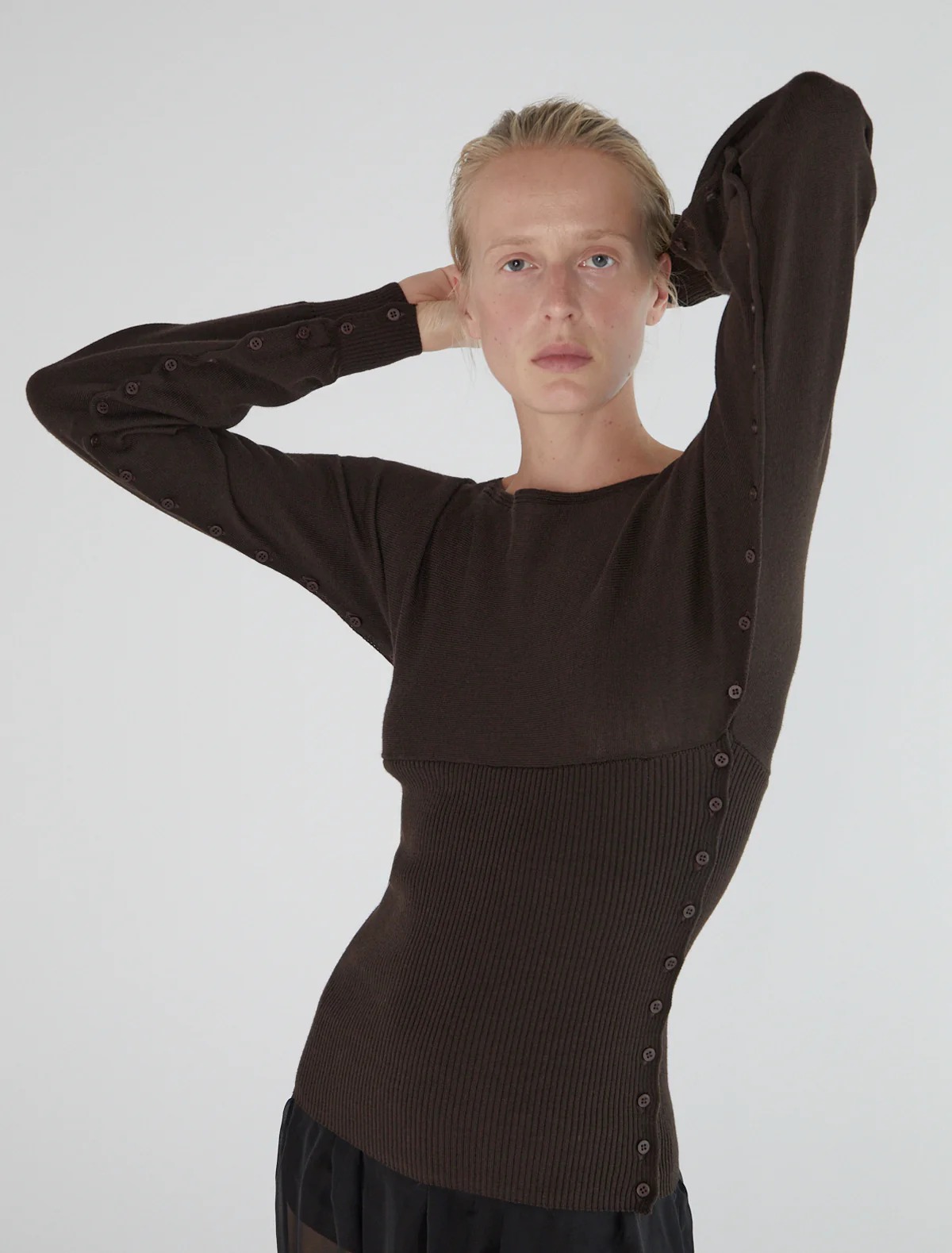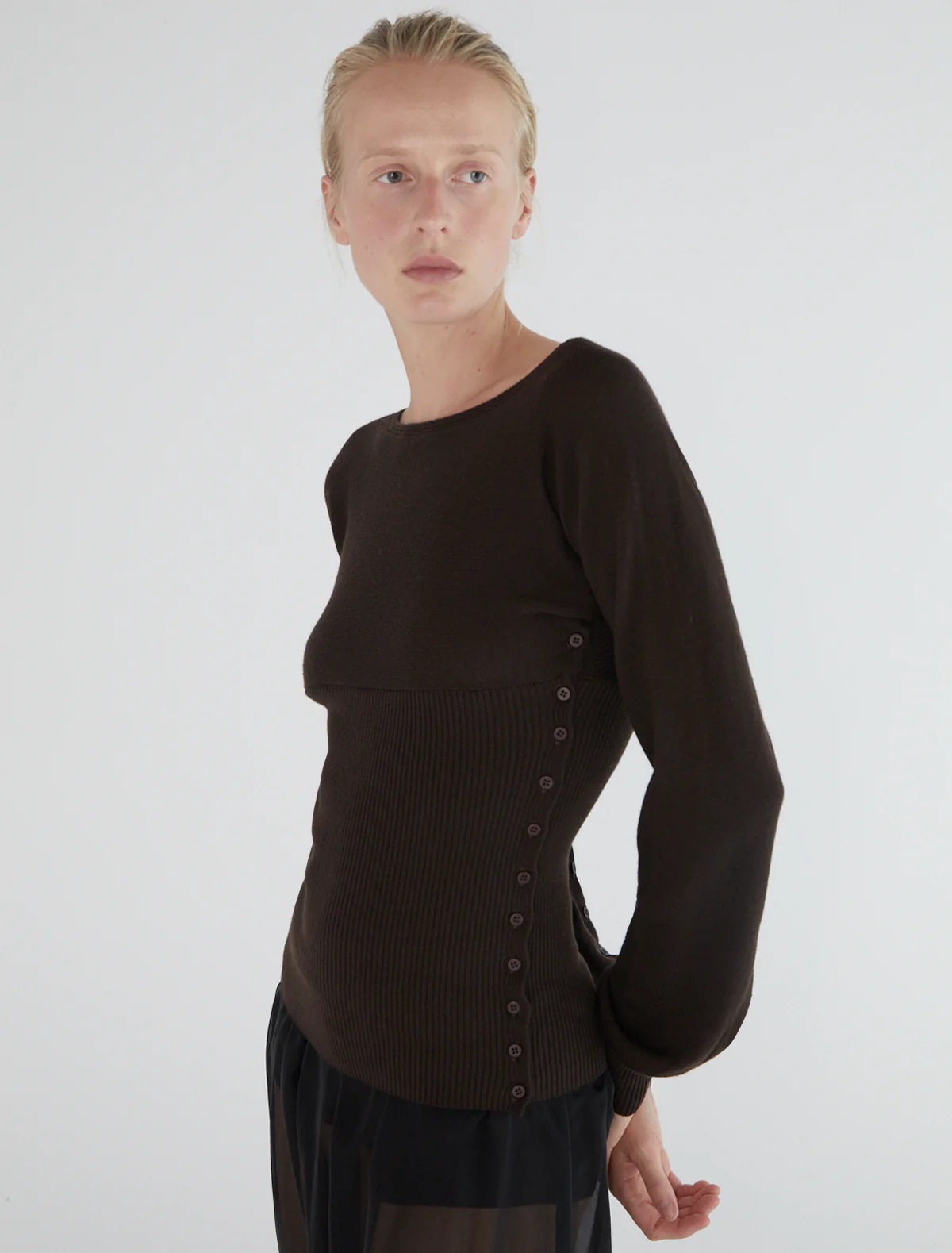 Brown Fa top by Paloma Wool in wool with wide neckline, asymmetrical side buttoning and open sleeves.