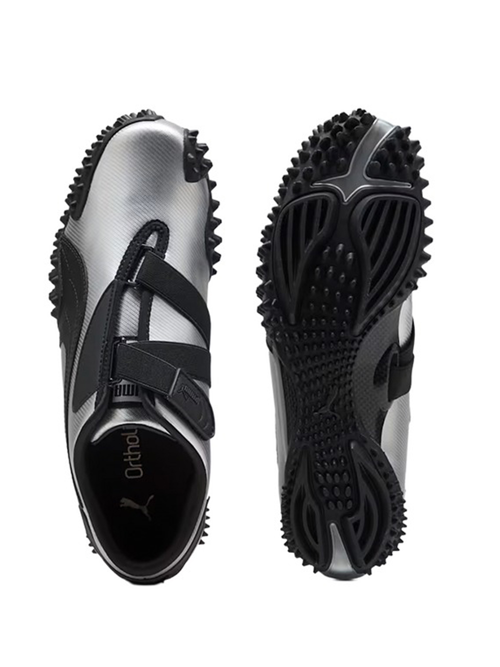 Silver Puma Mostro Metal sneakers in fabric with round toe, strap closure, and serrated rubber sole.