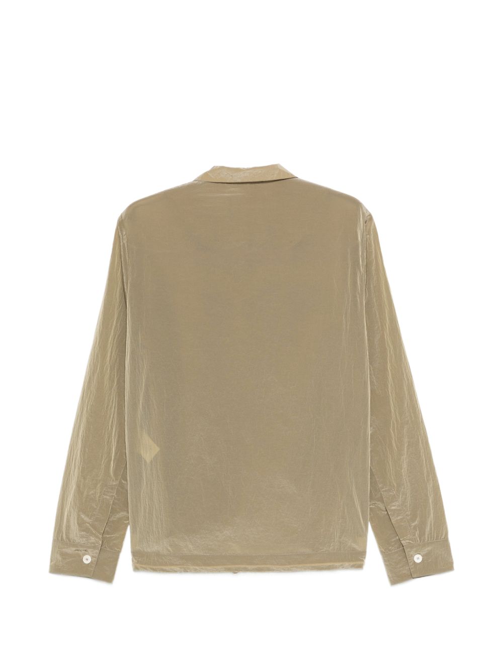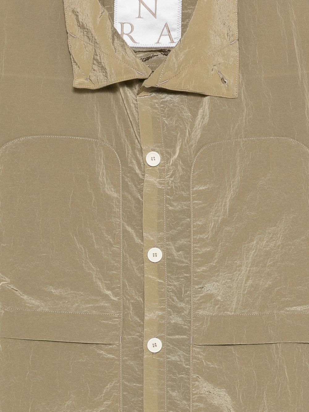 Beige Epitone jacket by ranra, made of polyamide, featuring a pointed collar, button closure, long sleeves, and front pockets.