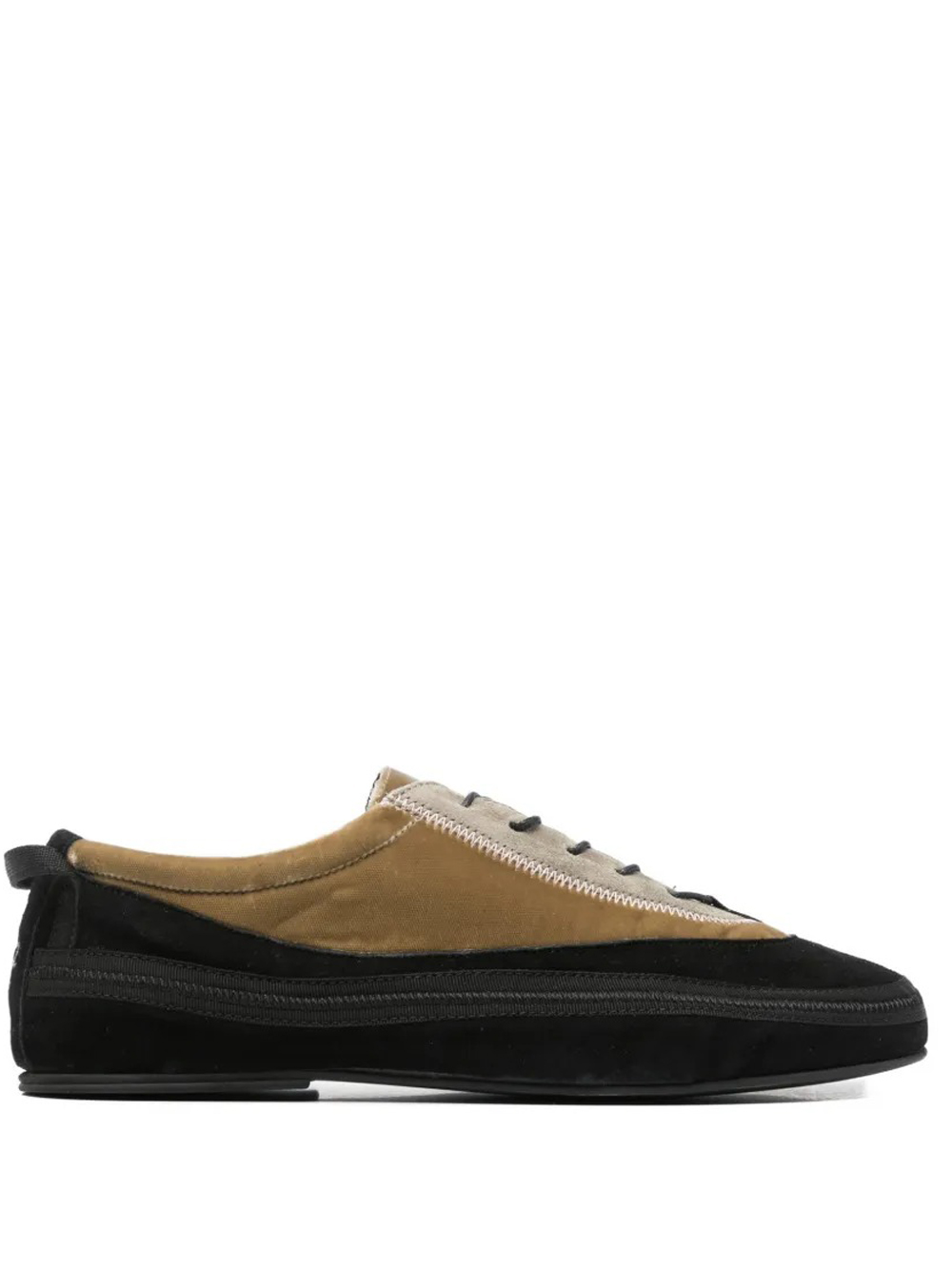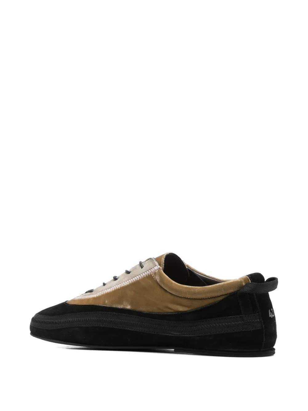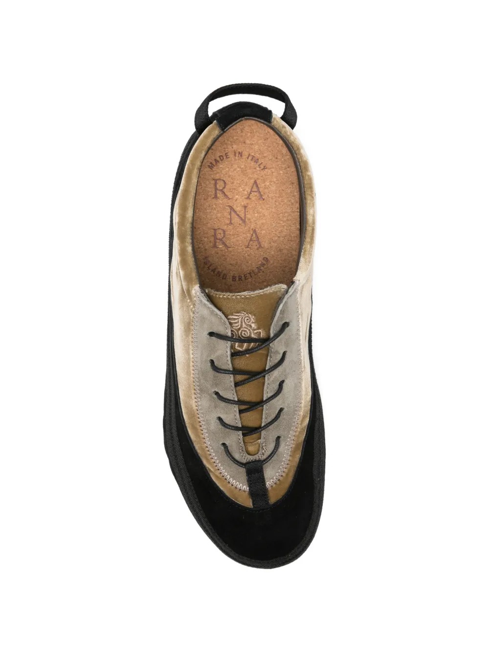 Ranra Heitt beige and black sneakers made of fabric and leather with accents, lace-up closure, and a heel tab.