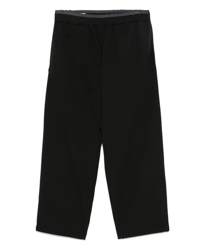 Black cotton Way Soft pants by Ranra with elasticized waistband, two side button pockets, a back logo applique, and a straight hem.