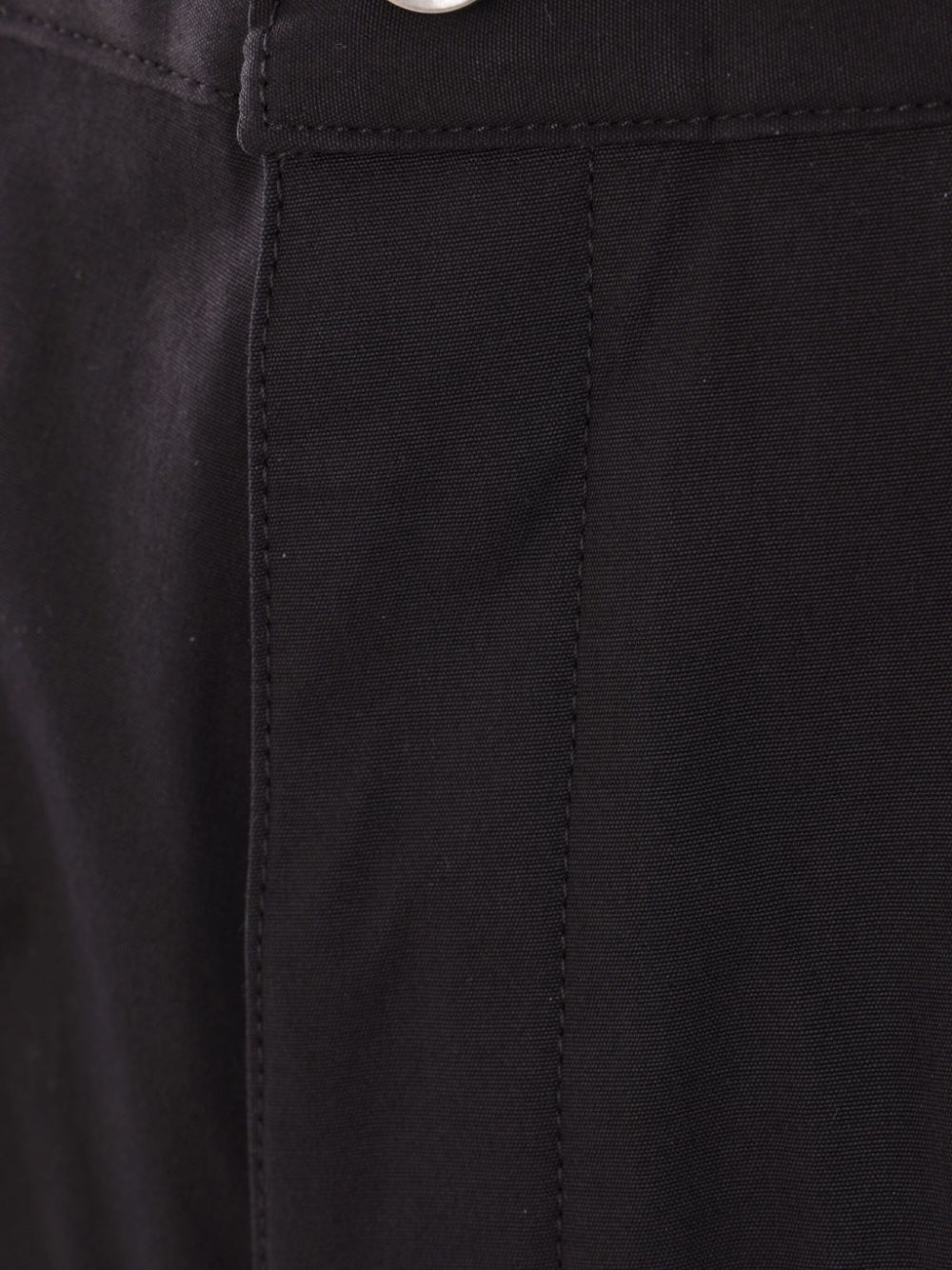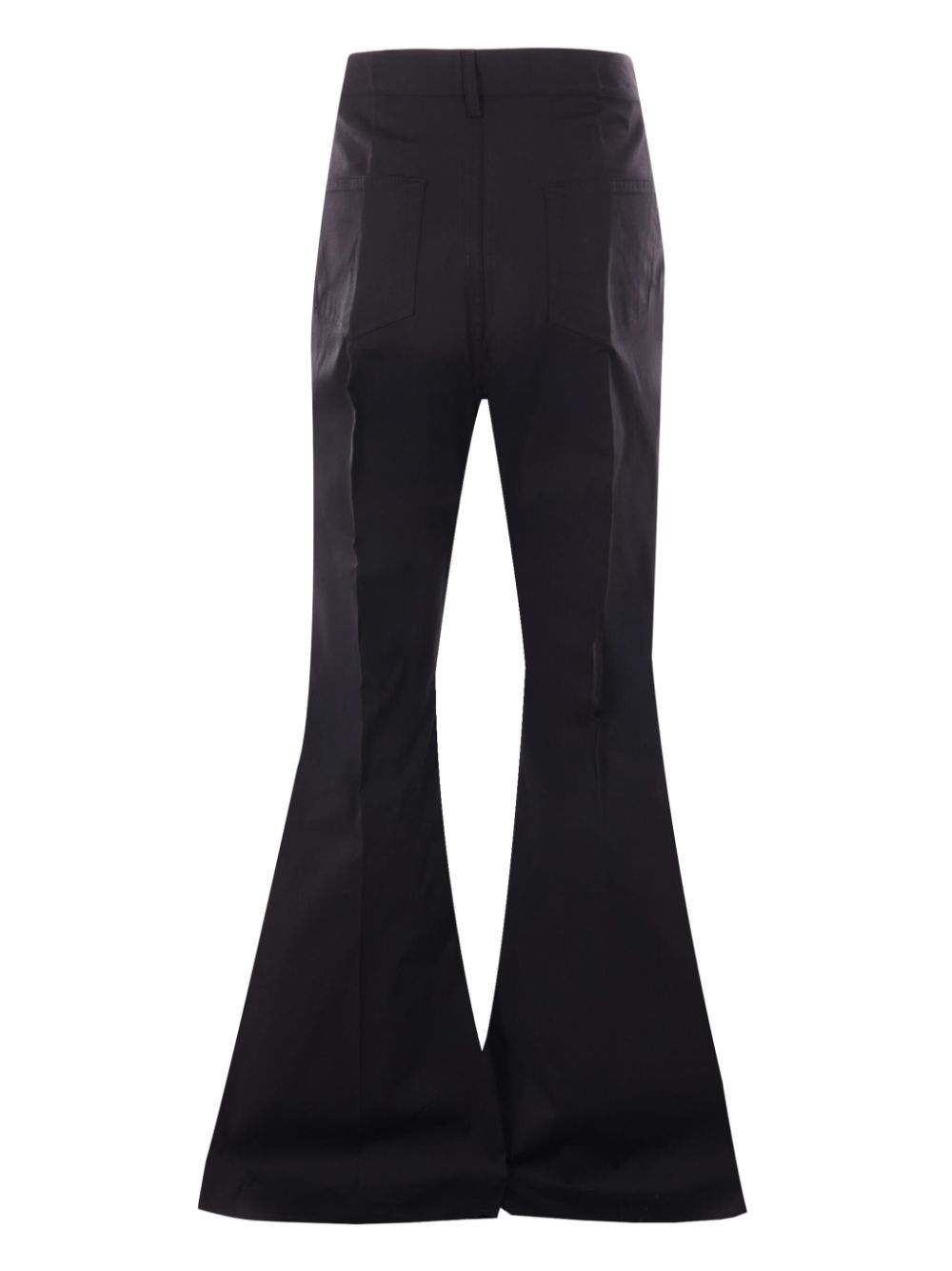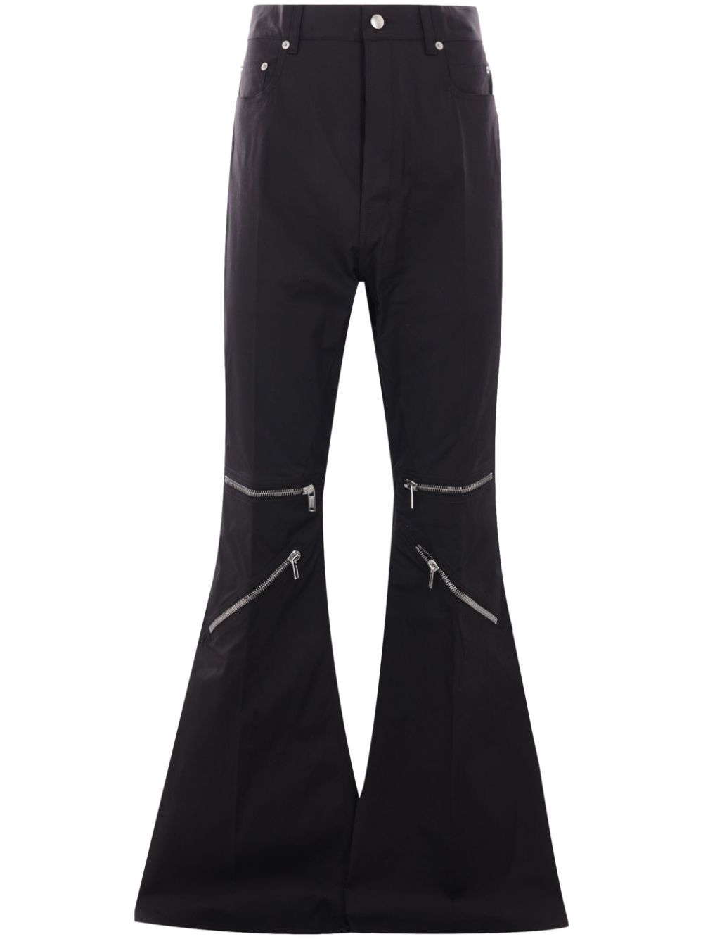 Black cotton Bolan pants by Rick Owens with waistband with belt loops, concealed button and zipper closure, zipper detail on legs, and straight hem.