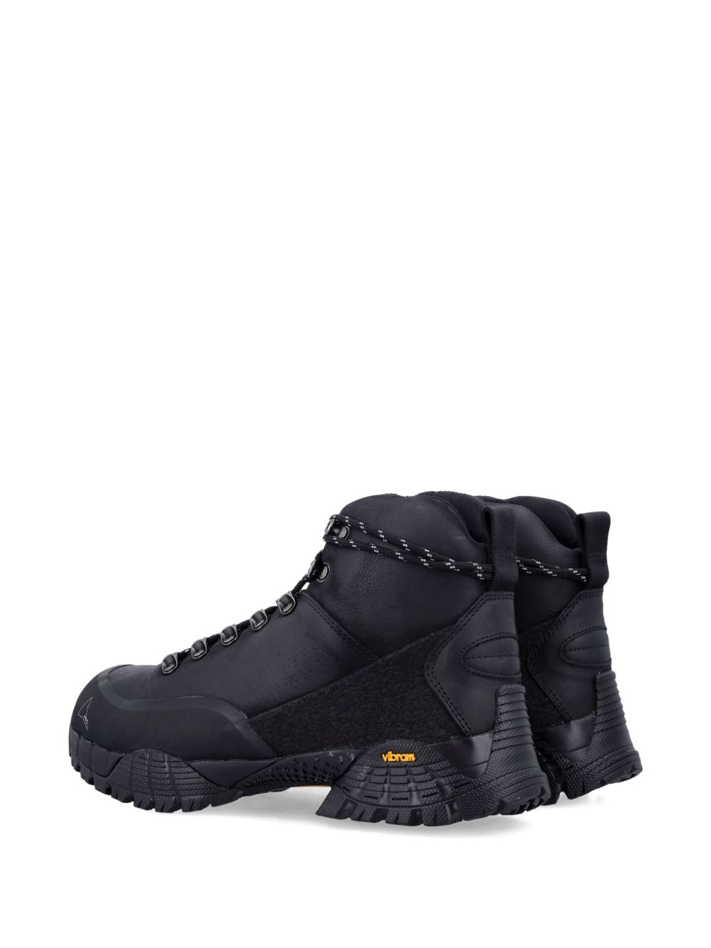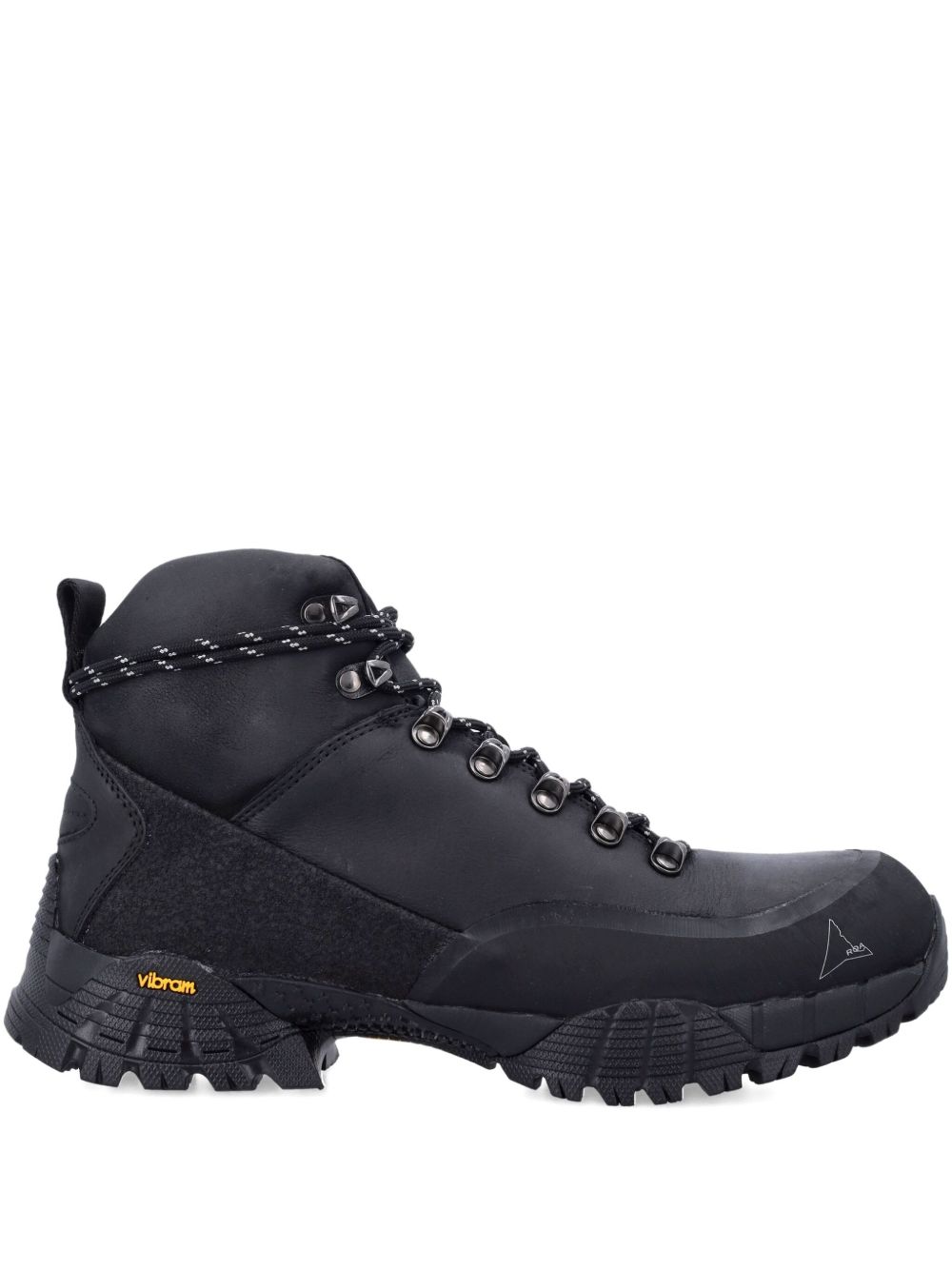 Black Andreas di Roa leather boots with front lace-up closure, design inserts, and serrated Vibram sole.