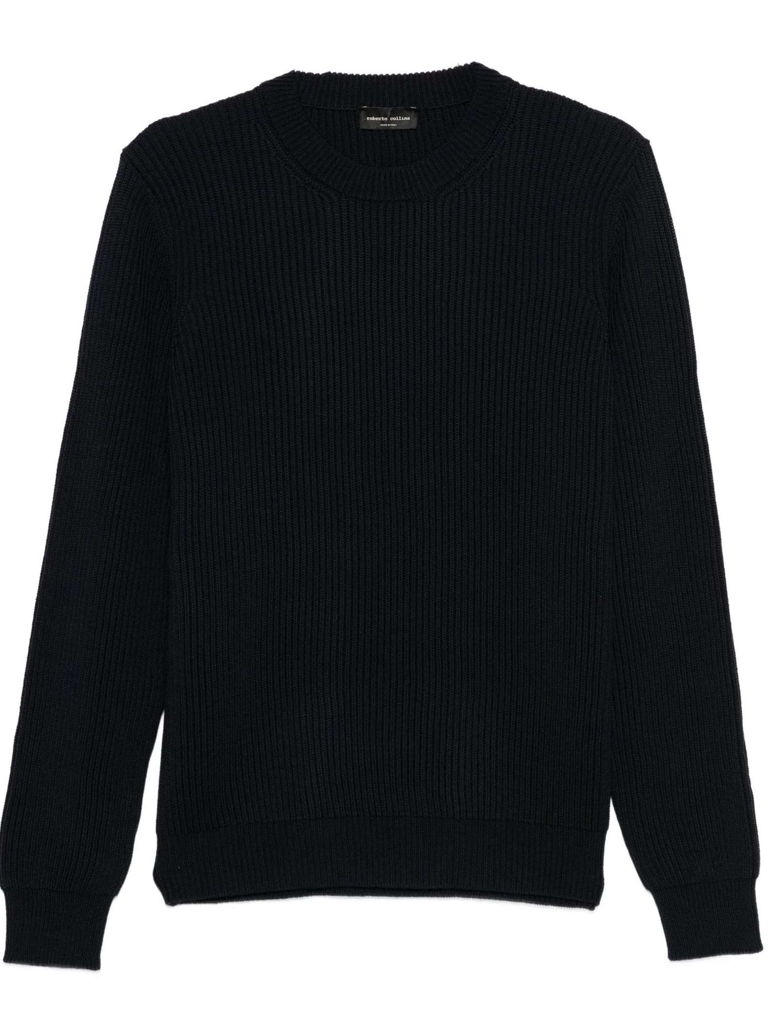 Navy blue sweater by Roberto Collina in wool with straight hem. Crew neck, ribbed knit, and straight hem.