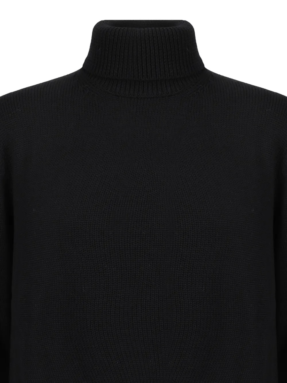 Black wool sweater by Roberto Collina with knitted high neck, long sleeves, ribbed hem, and ribbed cuffs.