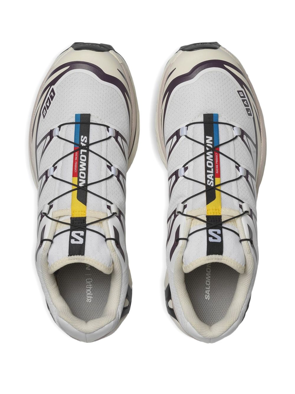 White XT-6 sneaker by Salomon in fabric with heat-sealed details, drawstring closure, round toe, fabric lining and textured rubber sole. Applied logo label on the tongue and printed logo on the side complete the design.