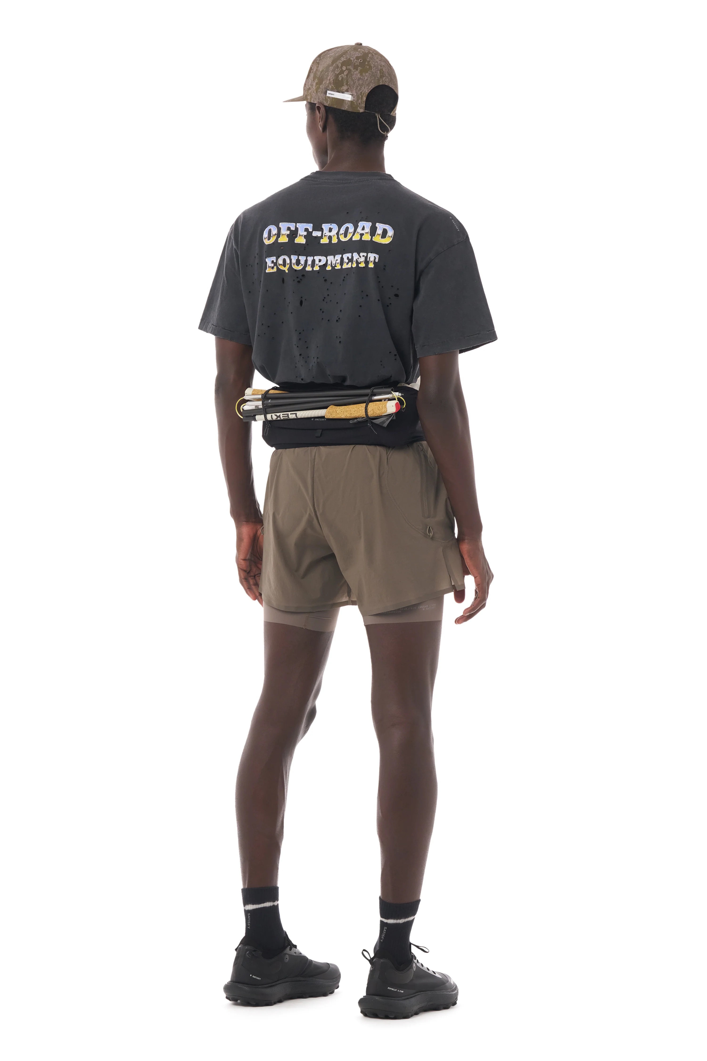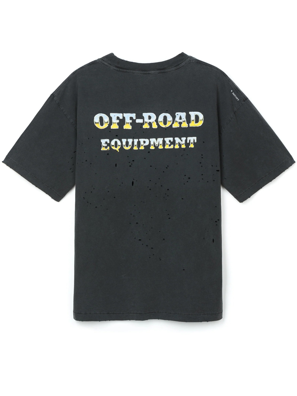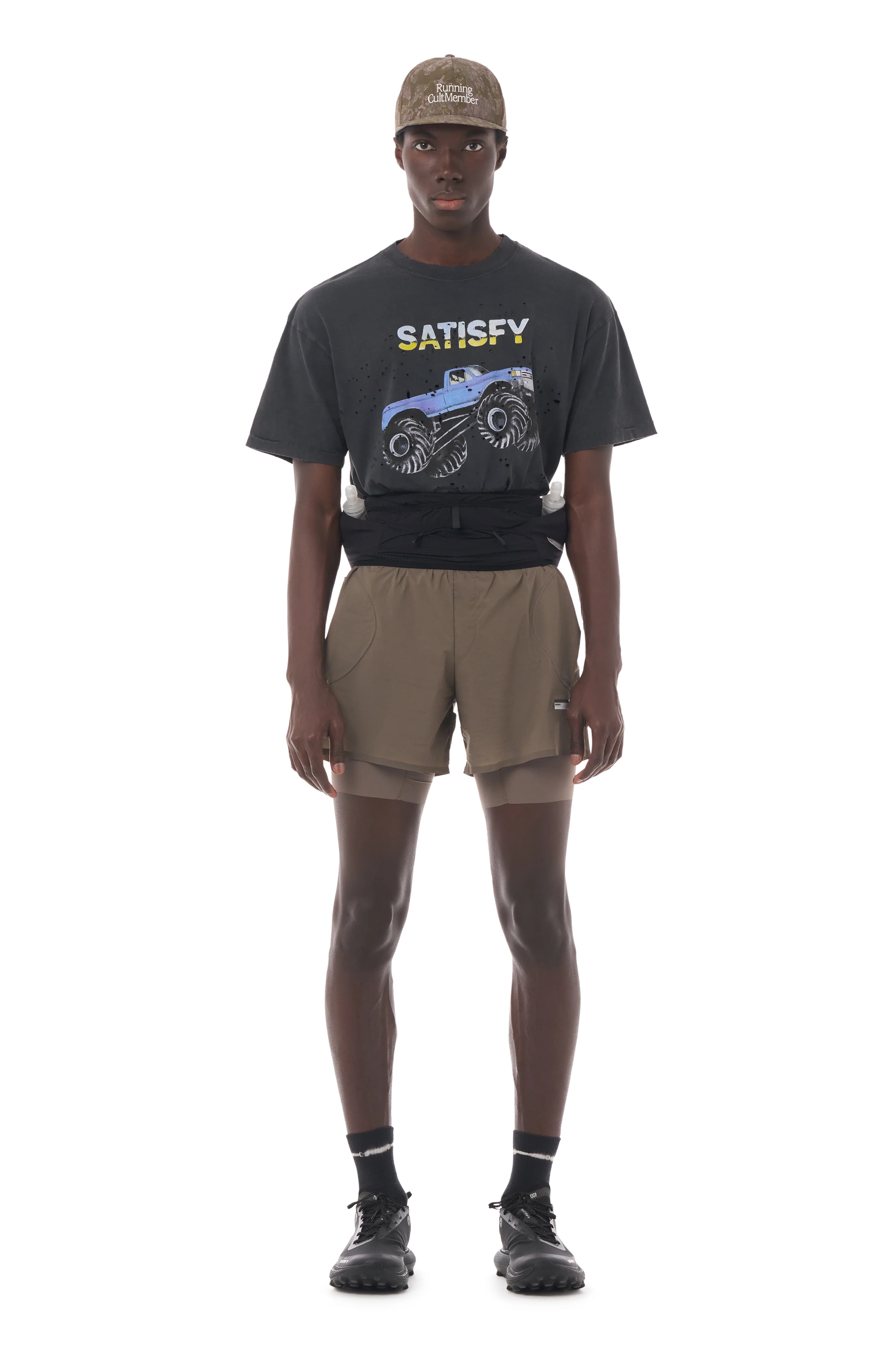 Black Satisfy T-shirt made of organic cotton, featuring a crew neck, short sleeves, front and back prints, a visible label, and a straight hem.