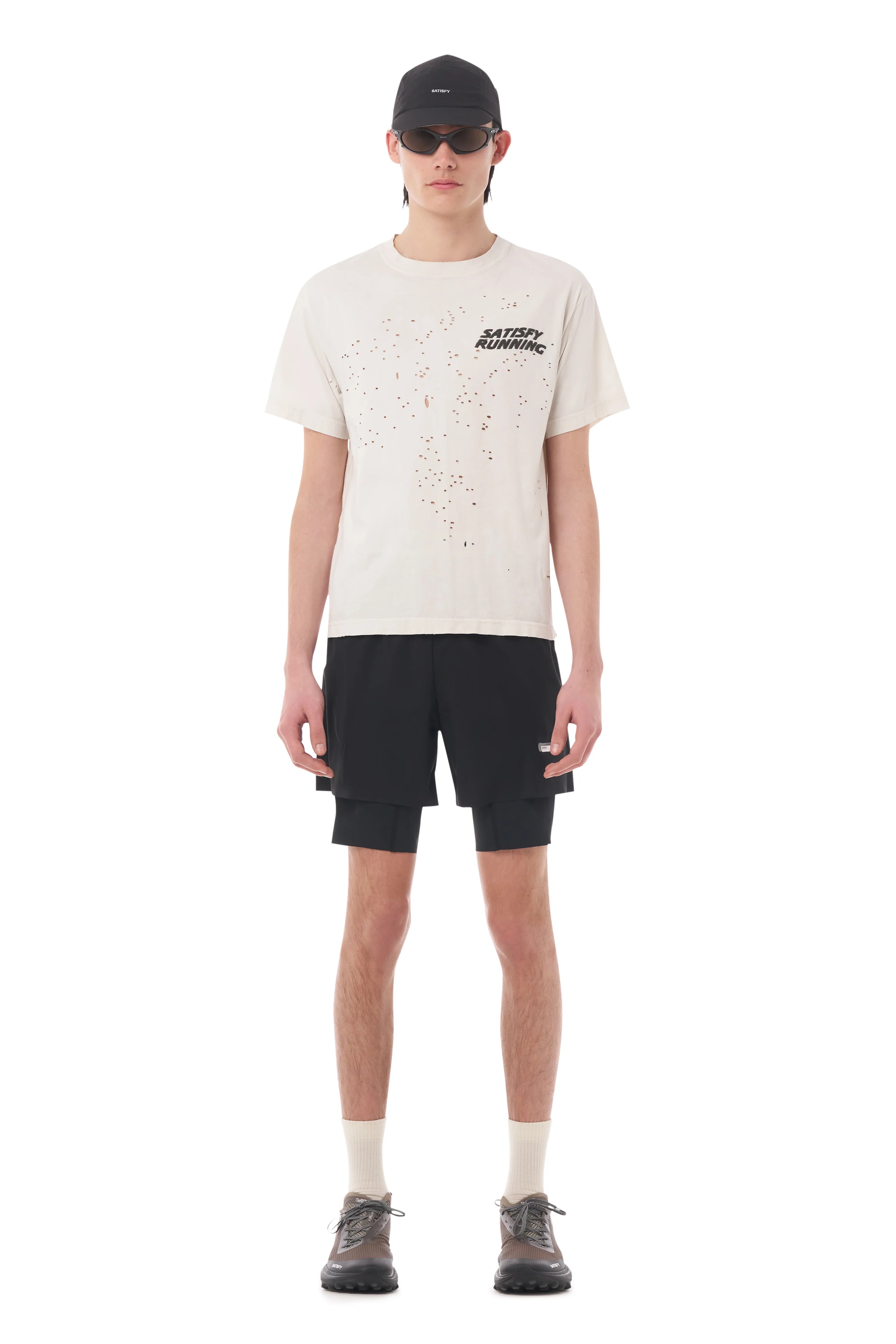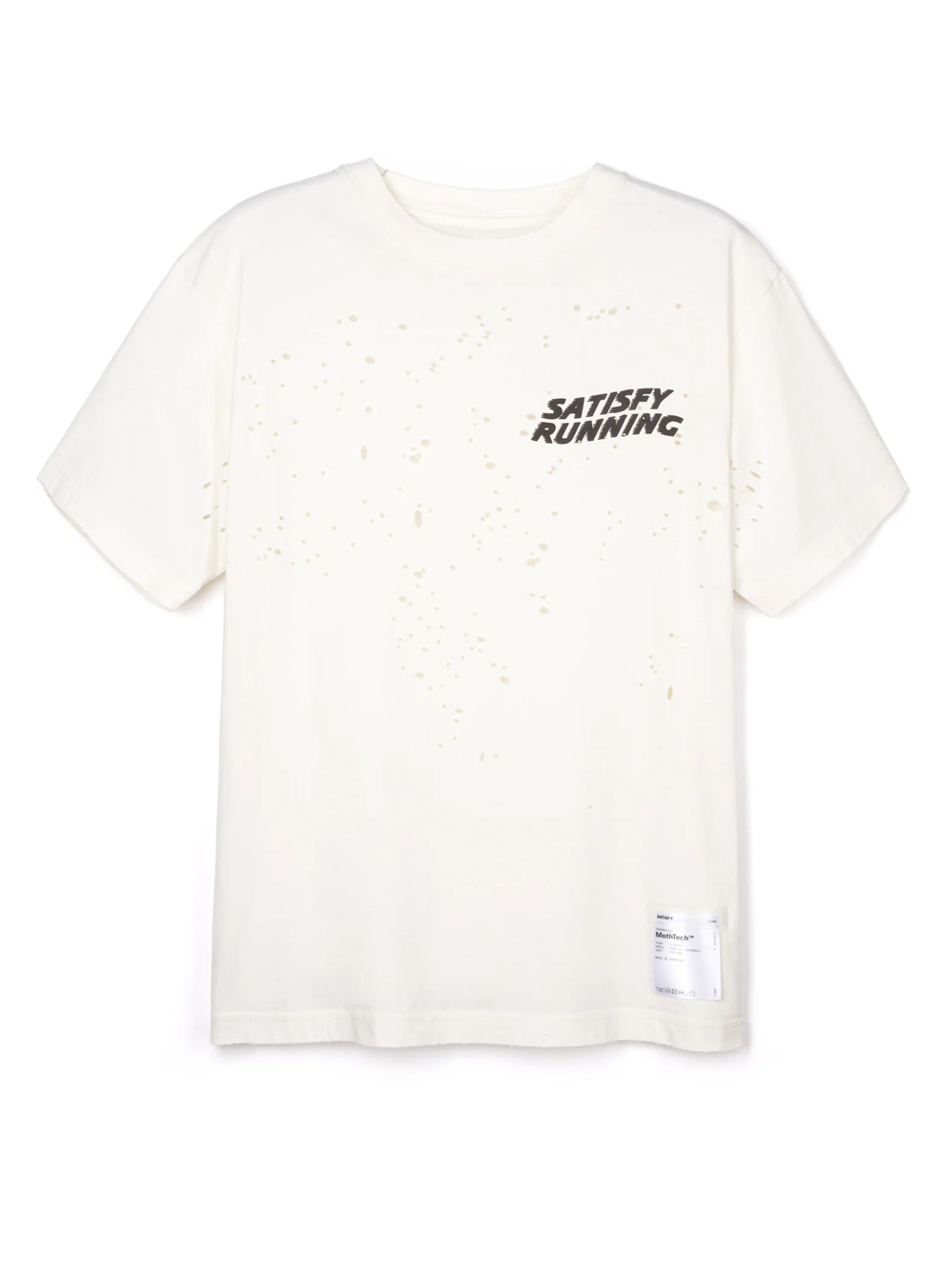 Black Satisfy T-shirt made of organic cotton, featuring a crew neck, short sleeves, a side print, a visible label, and a straight hem.