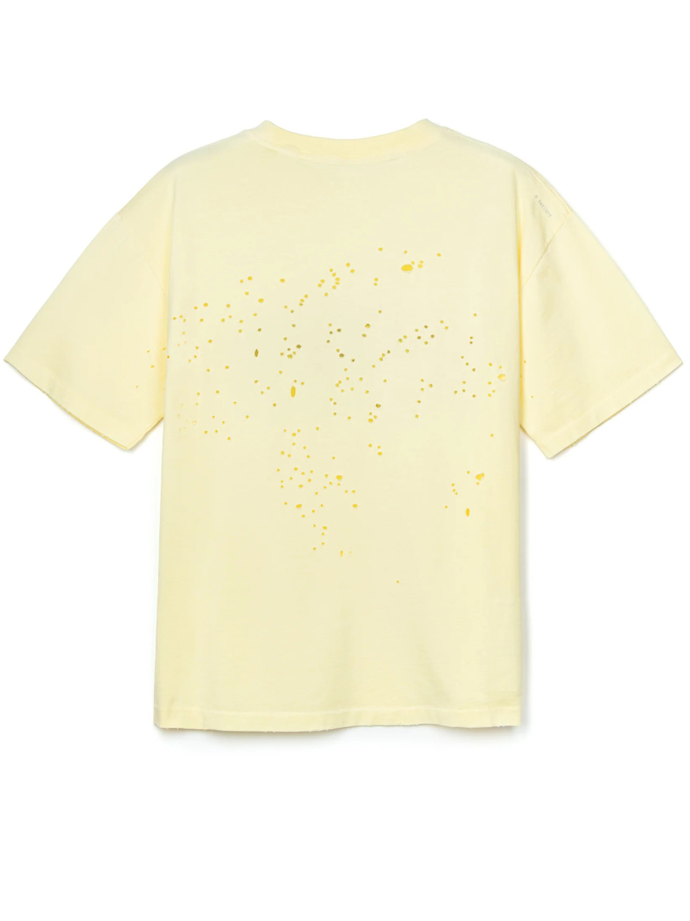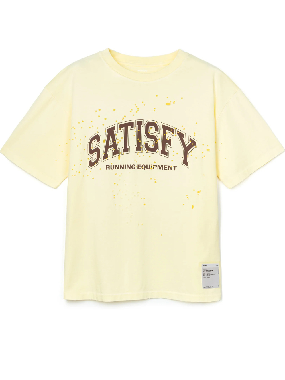 Yellow Satisfy T-shirt made of organic cotton, featuring a crew neck, short sleeves, a front print, a visible label, and a straight hem.