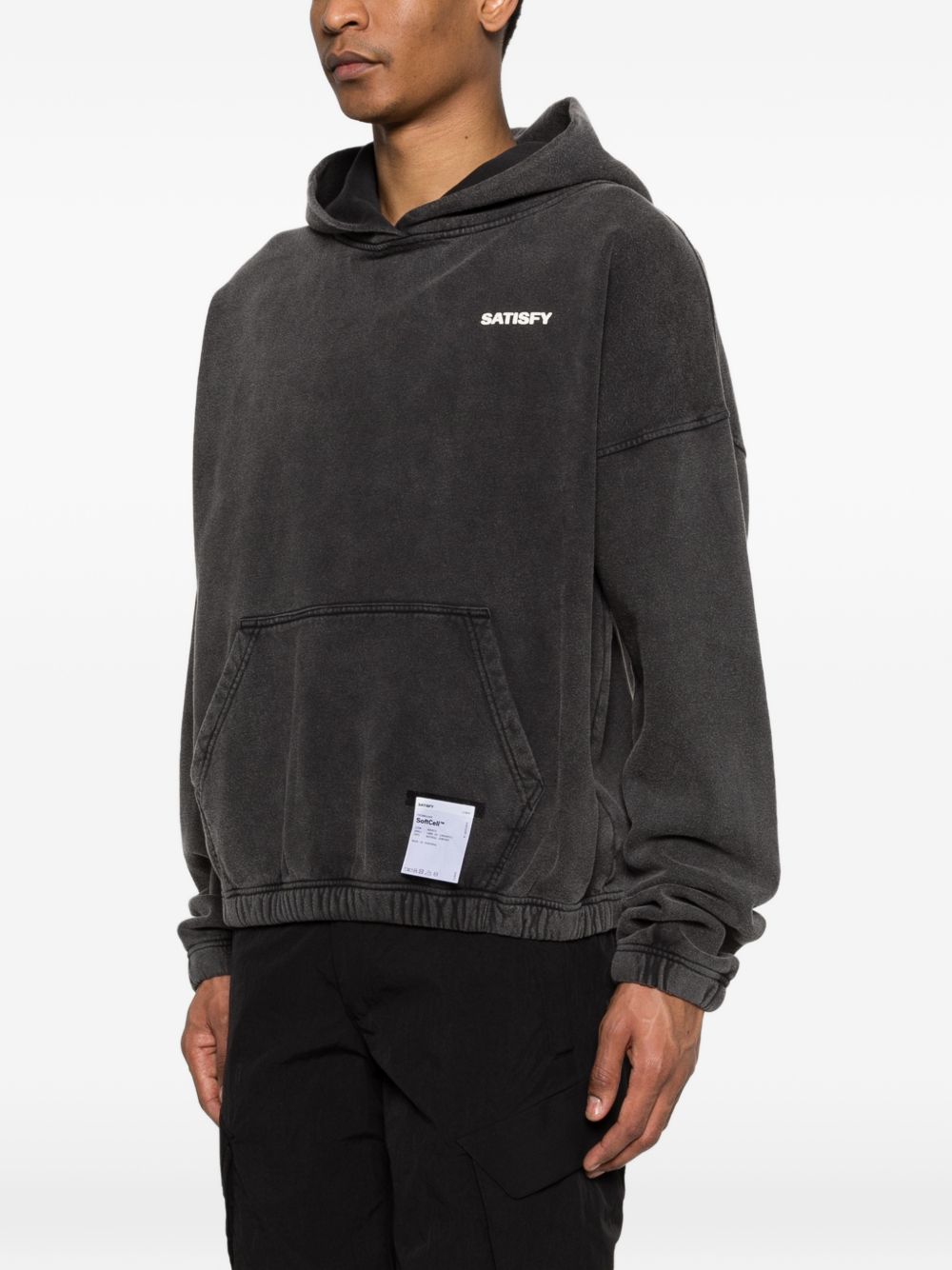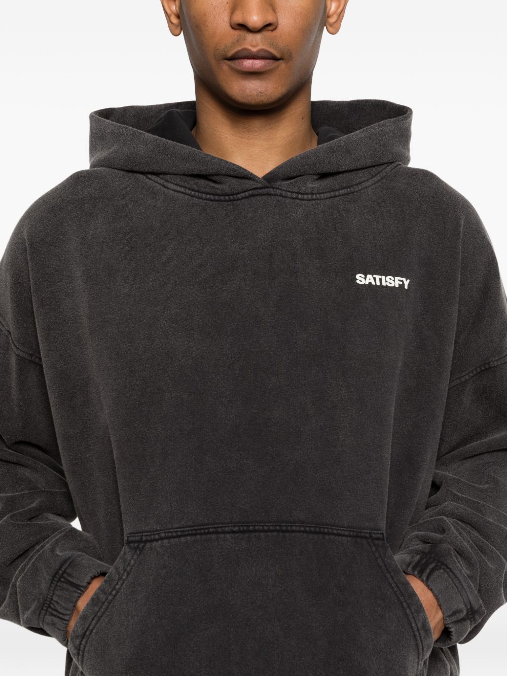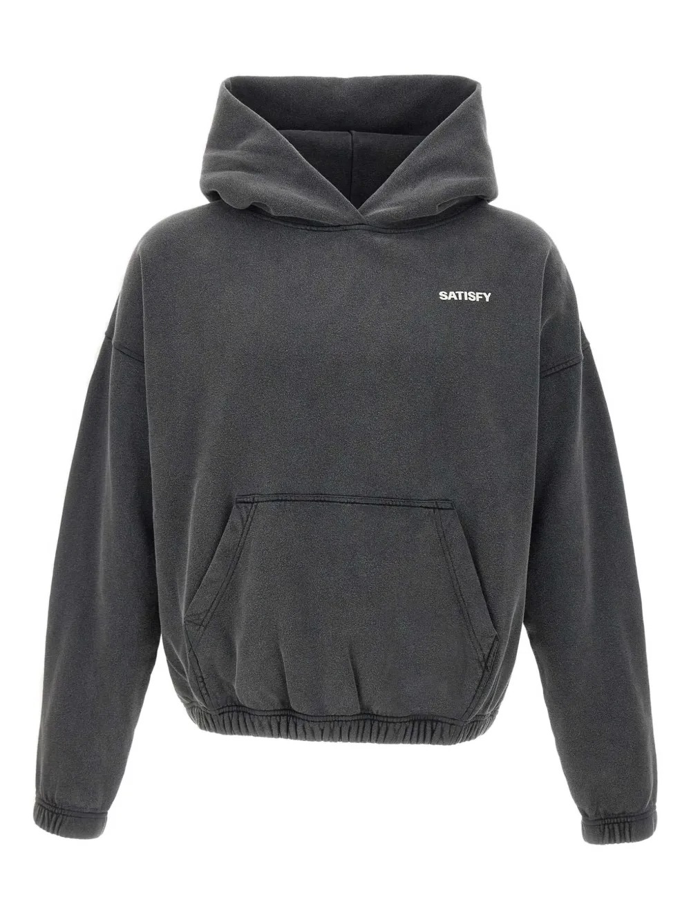 Black Satisfy hooded sweatshirt made of organic cotton, featuring a front pocket and elasticated hem and cuffs.