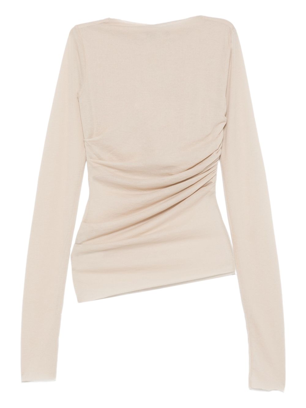 Gaia ecrù khaki T-shirt by Soeur in cotton with a straight, wide neckline, long sleeves, and ruffle details.