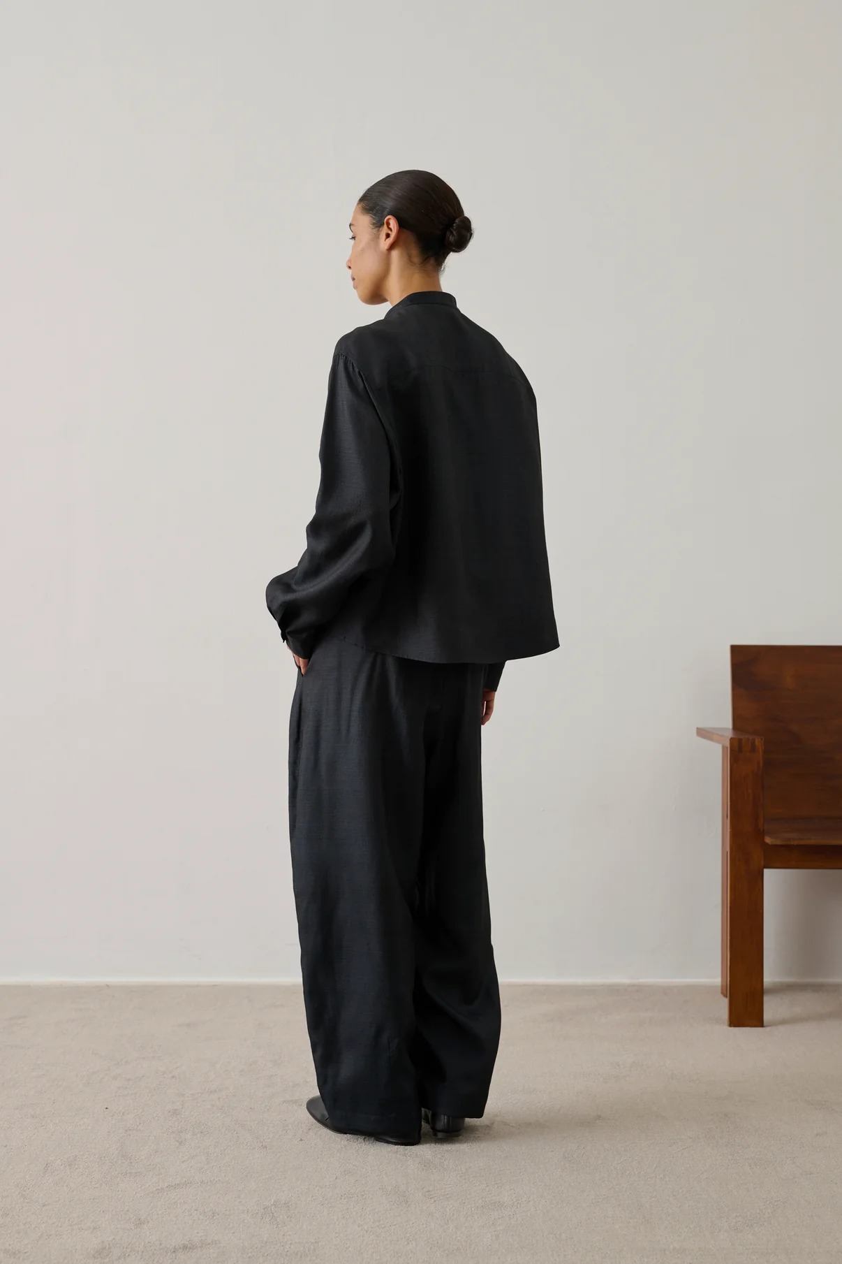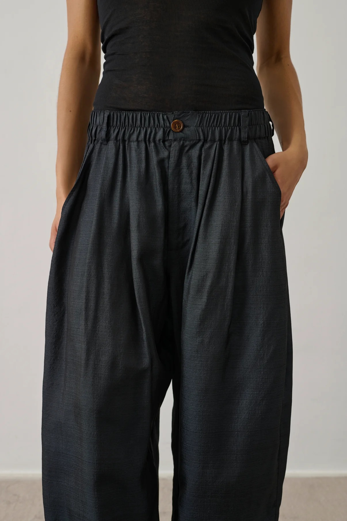 Vernon black trousers by Soeur in cotton with elasticated waist, front closure with button and zip, and straight hem.