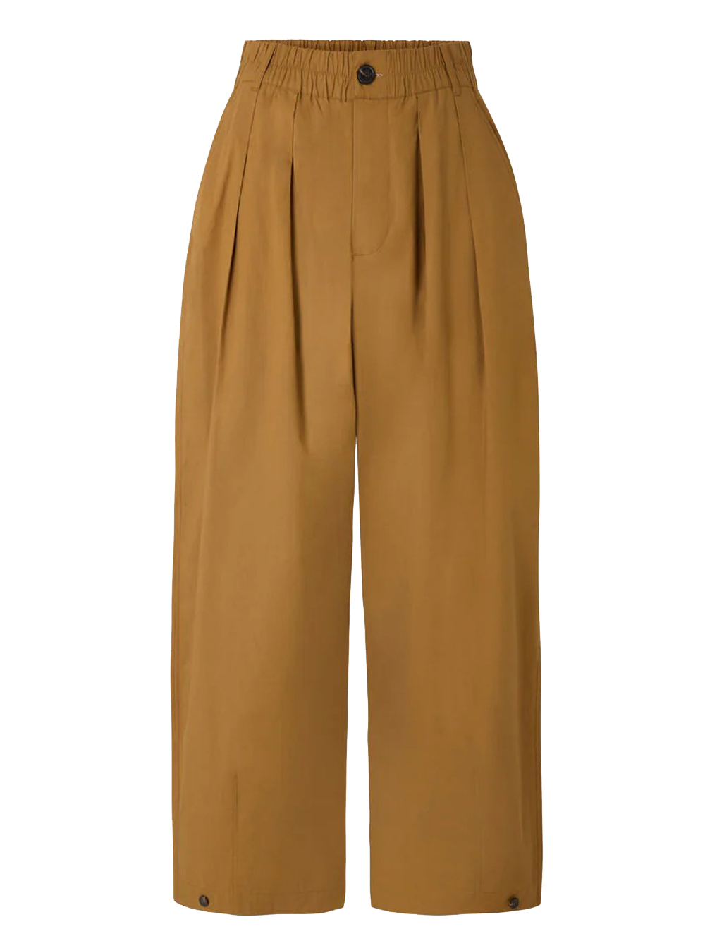 Vernon caramel trousers by Soeur in cotton with elasticated waist, front closure with button and zip, and straight hem.