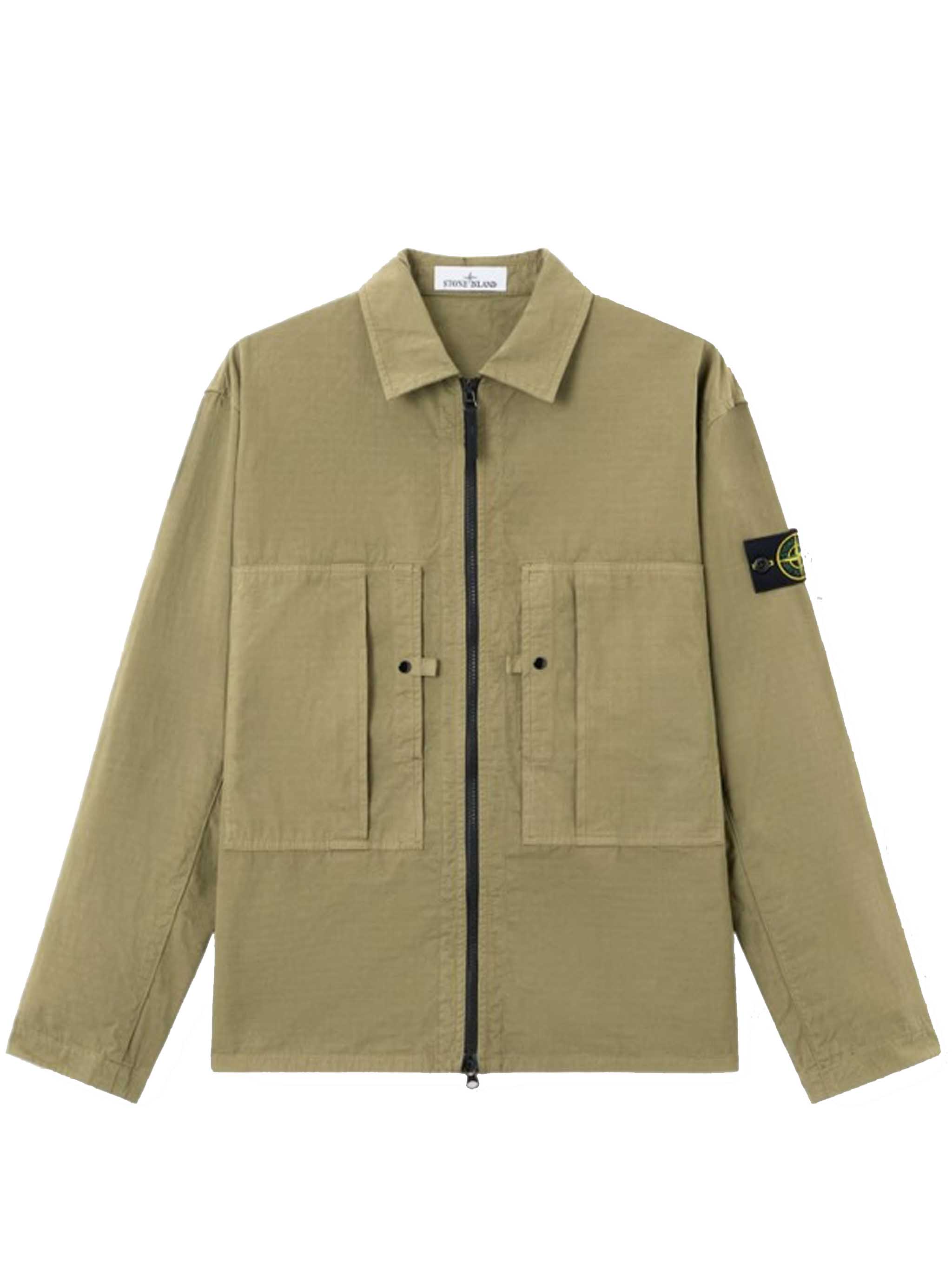 Stone Island military green overshirt in cotton denim with classic collar, front zip closure, chest pockets, badge, and straight hem.