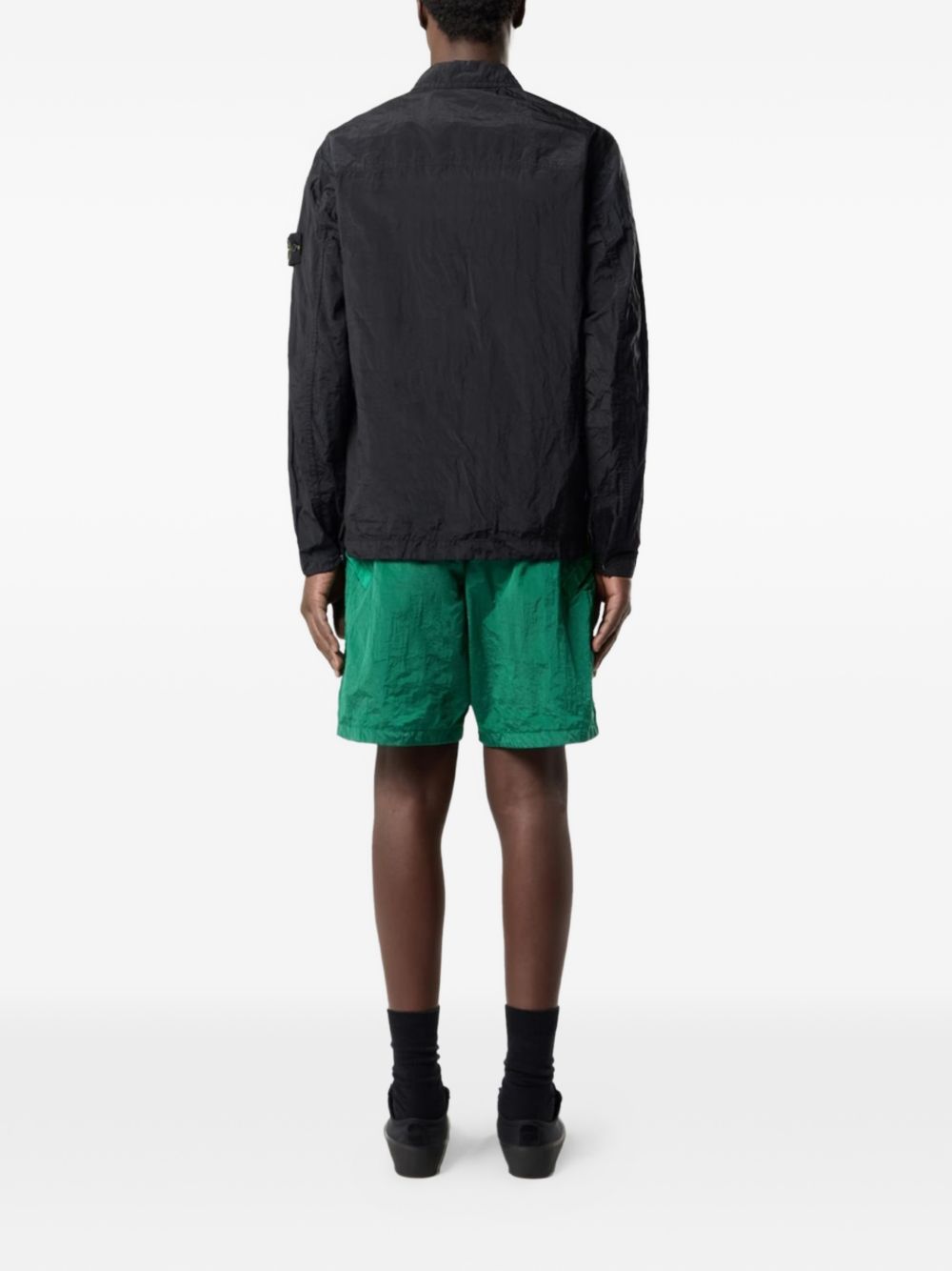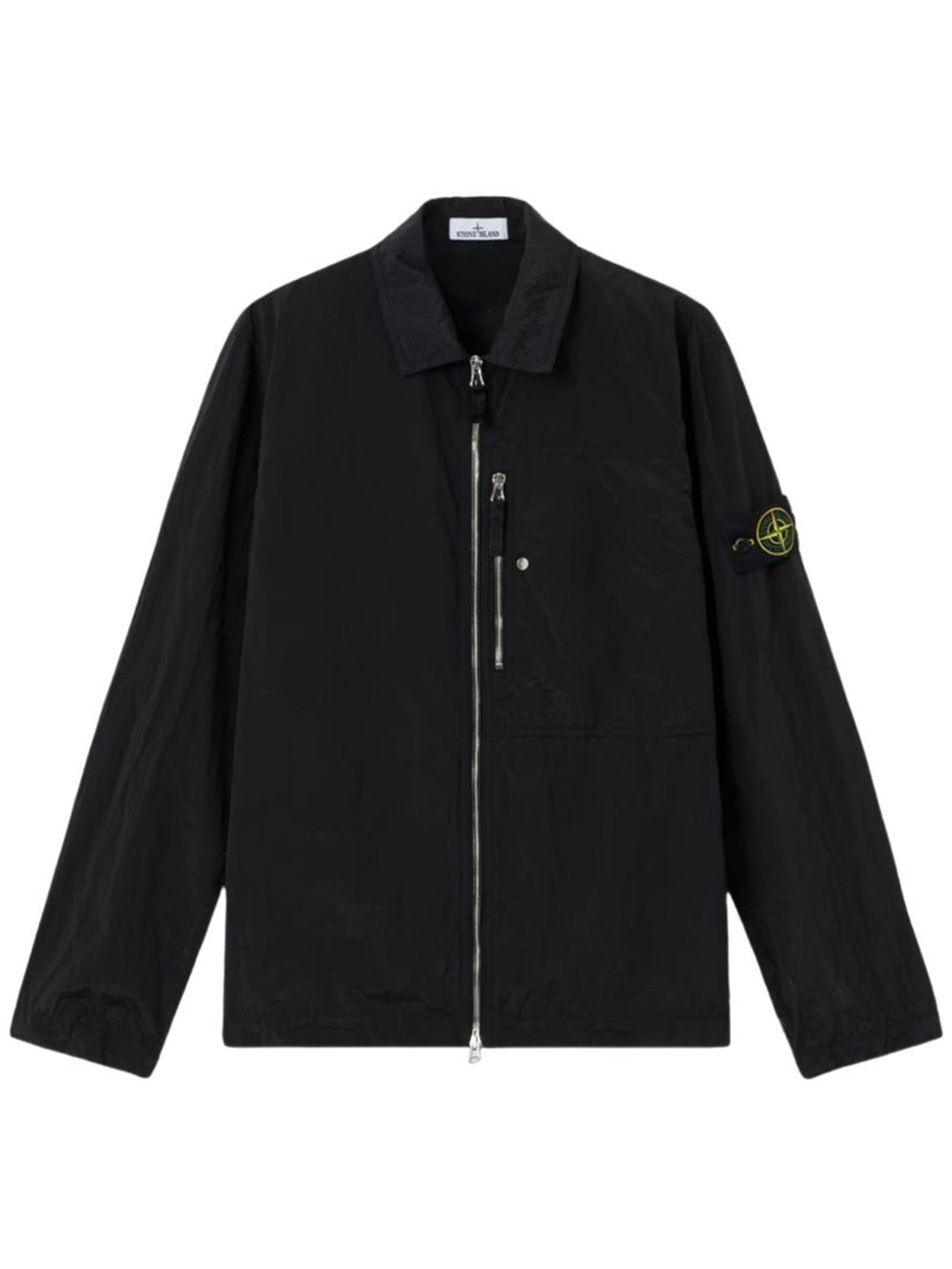 Stone Island Black Overshirt 1200038 in recycled ECONYL® with a zip closure, chest pocket, collar, and long sleeves.