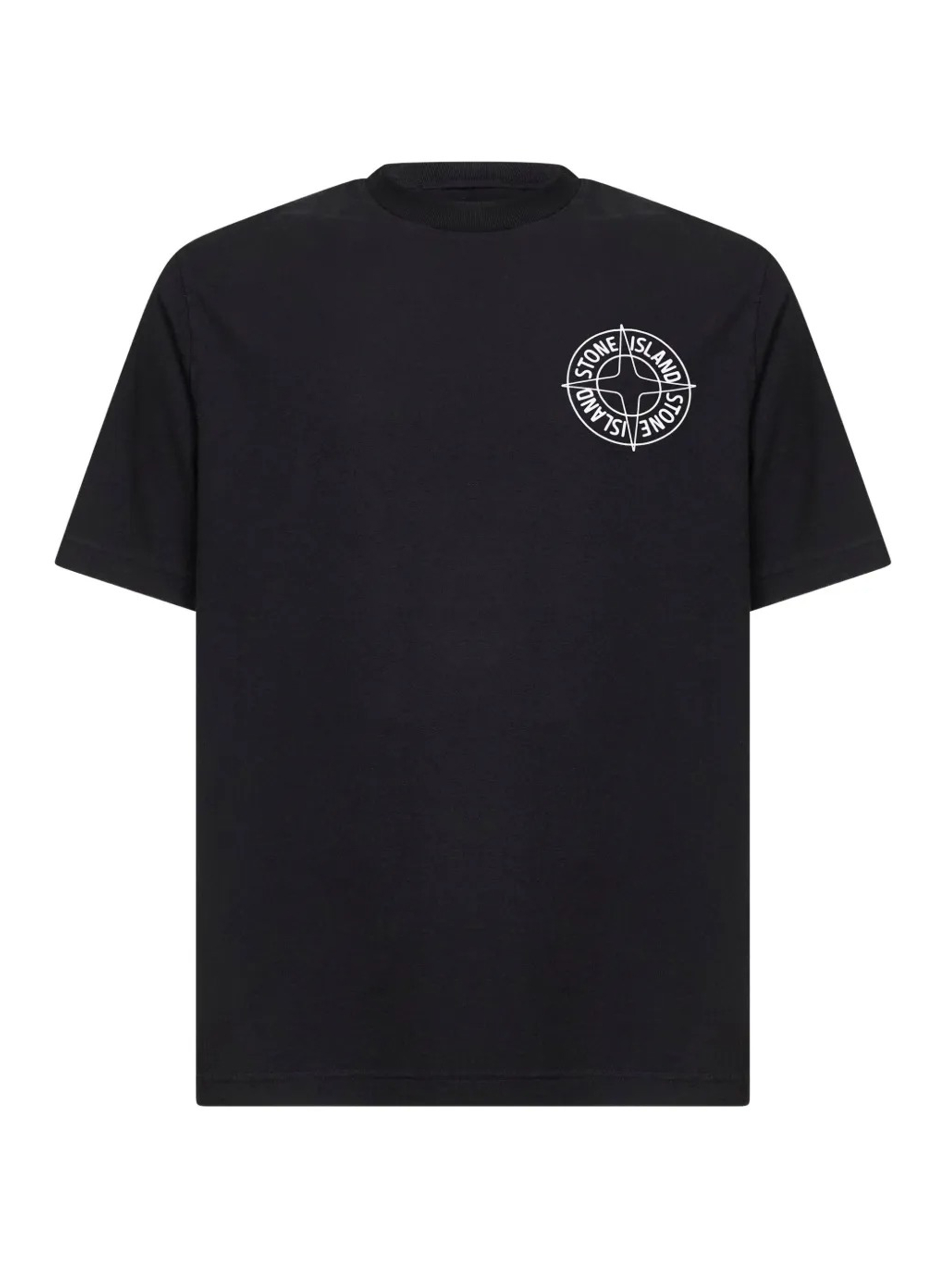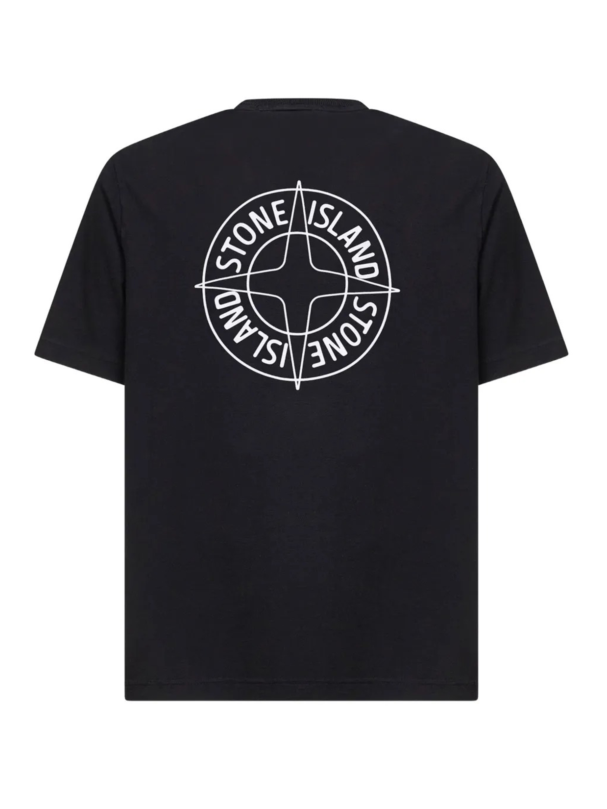 Black Stone Island cotton T-shirt with crew neck, front and back print, short sleeves, and straight hem.