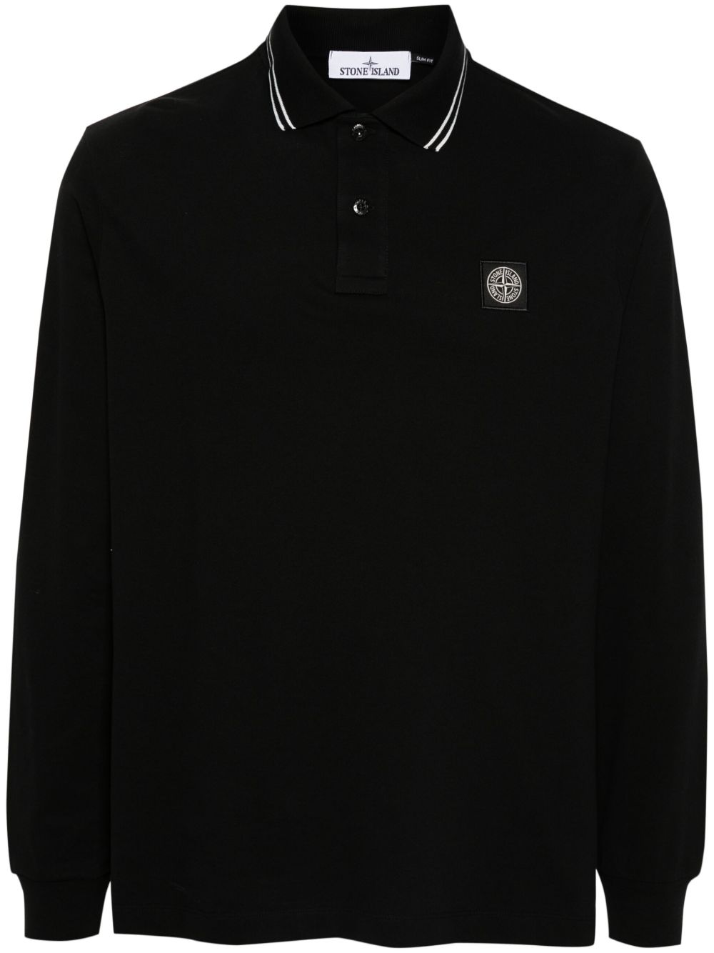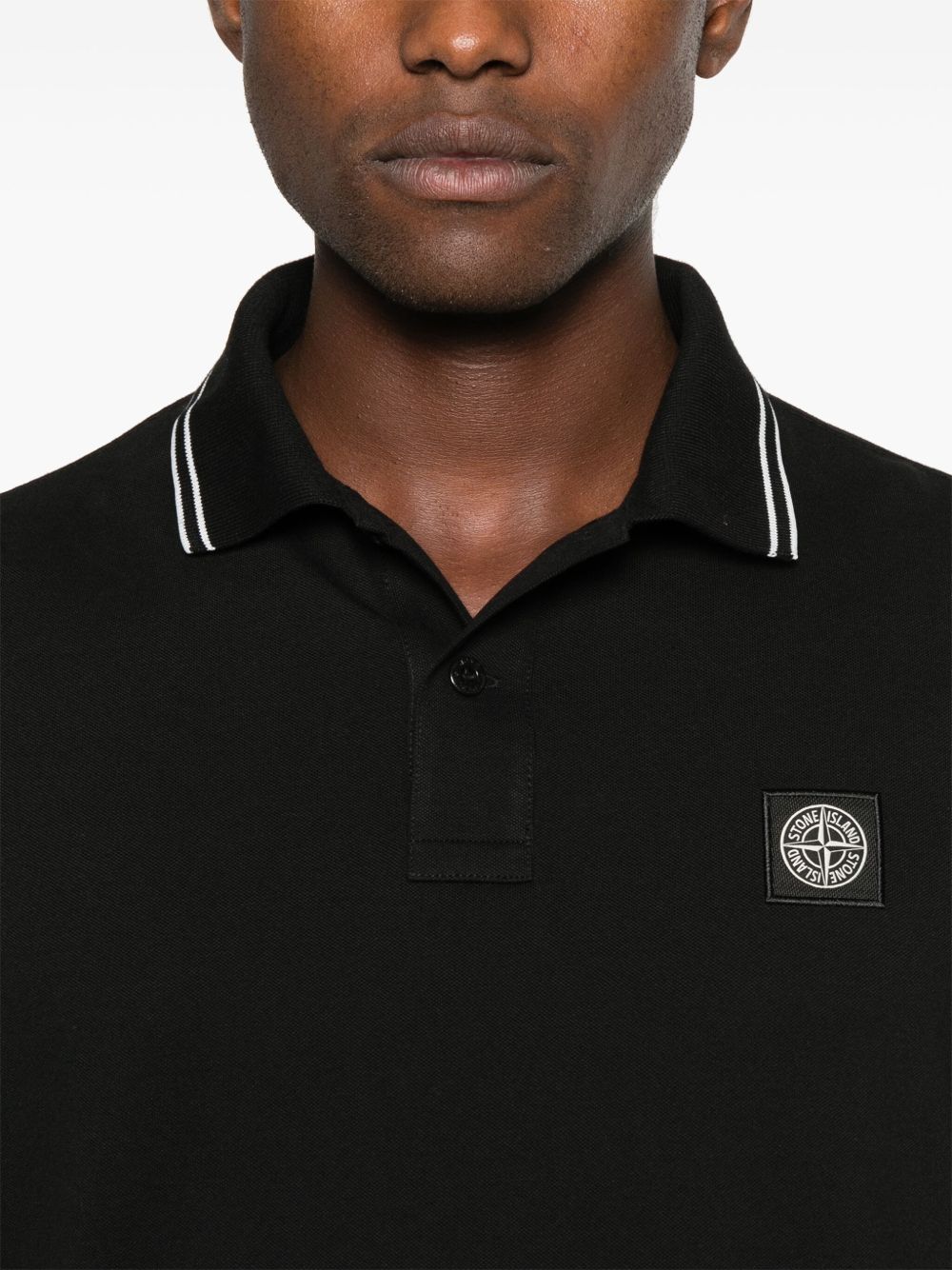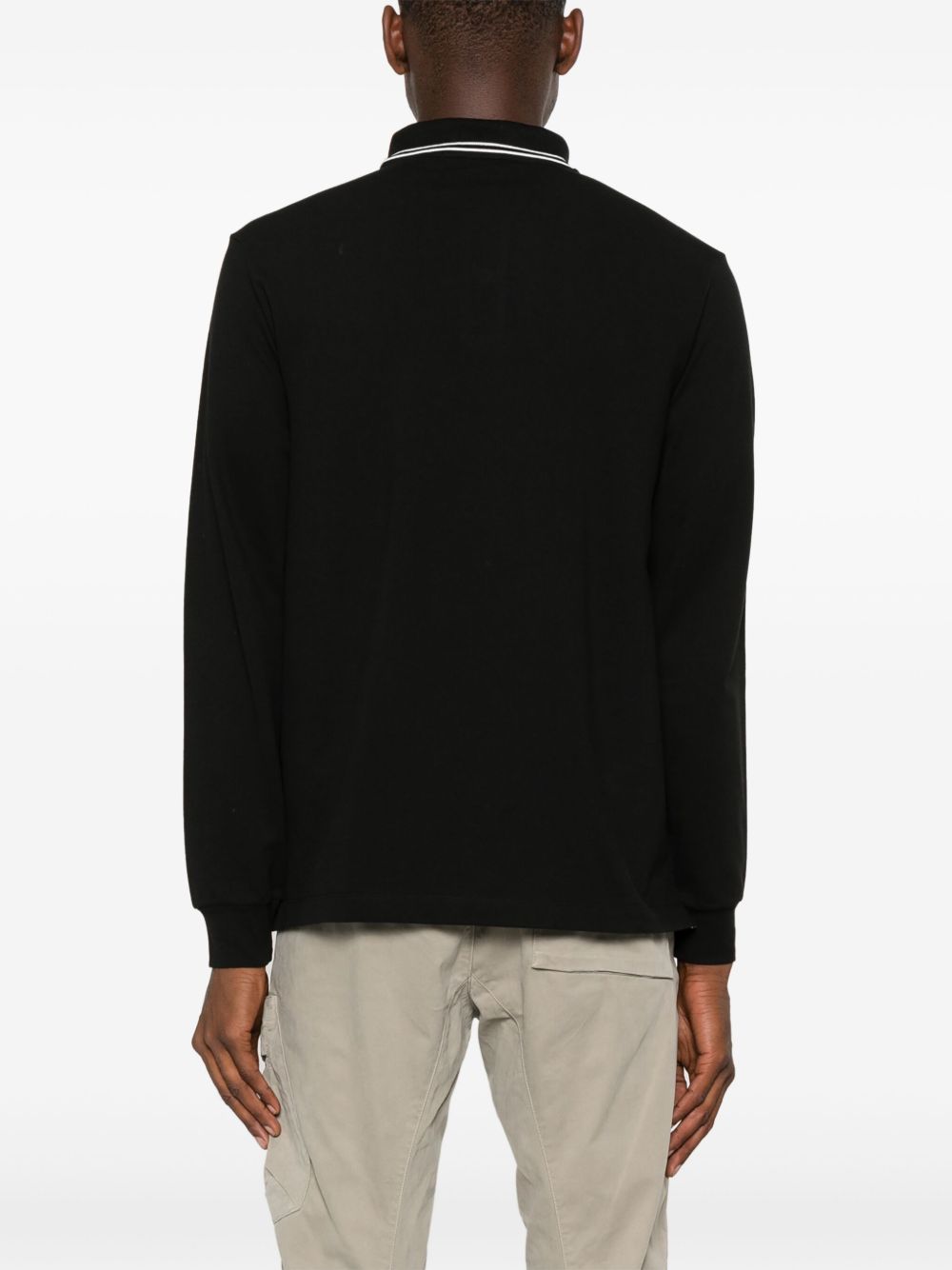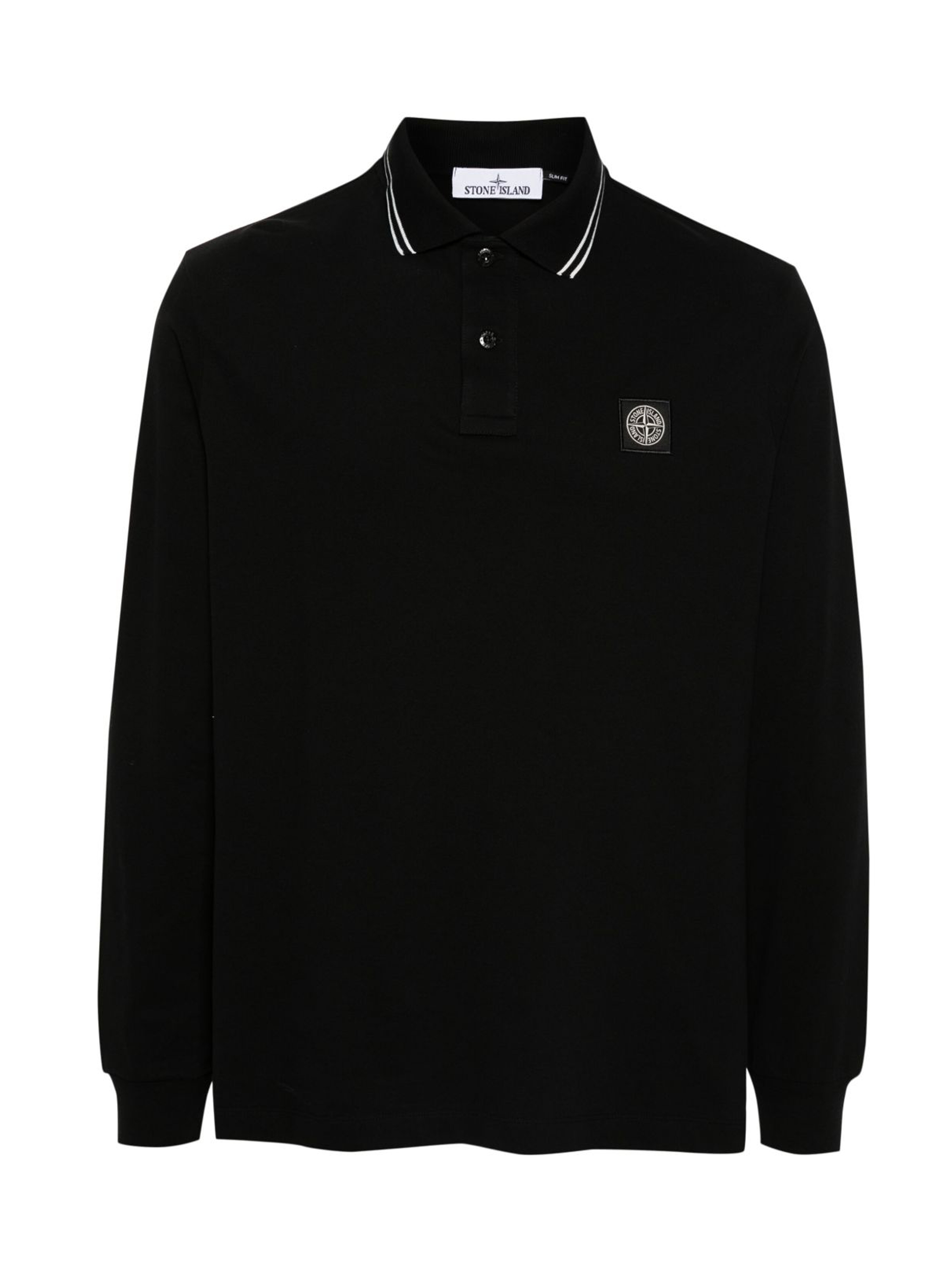 Polo nera di Stone Island in cotone con coletto classico, etichetta con logo, manica lunga e orlo dritto.