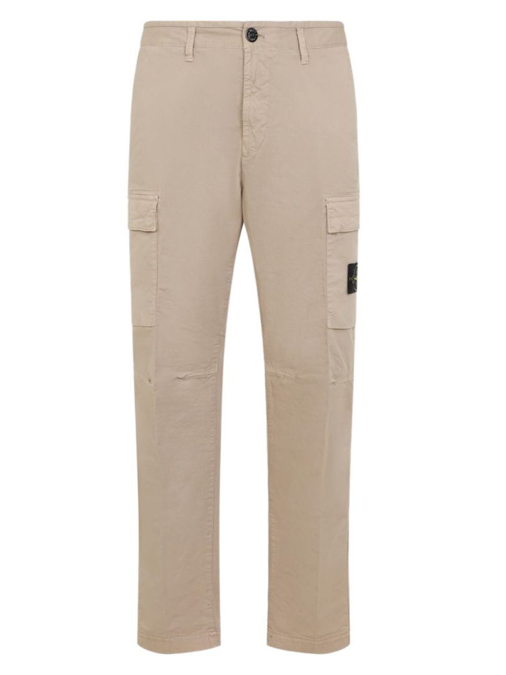 Desert Stone Island cotton pants with belt loops, front button and zip closure, side cargo pockets, back pocket, and straight hem.