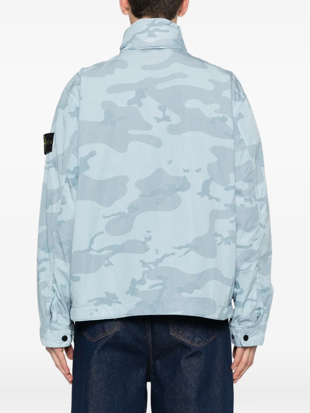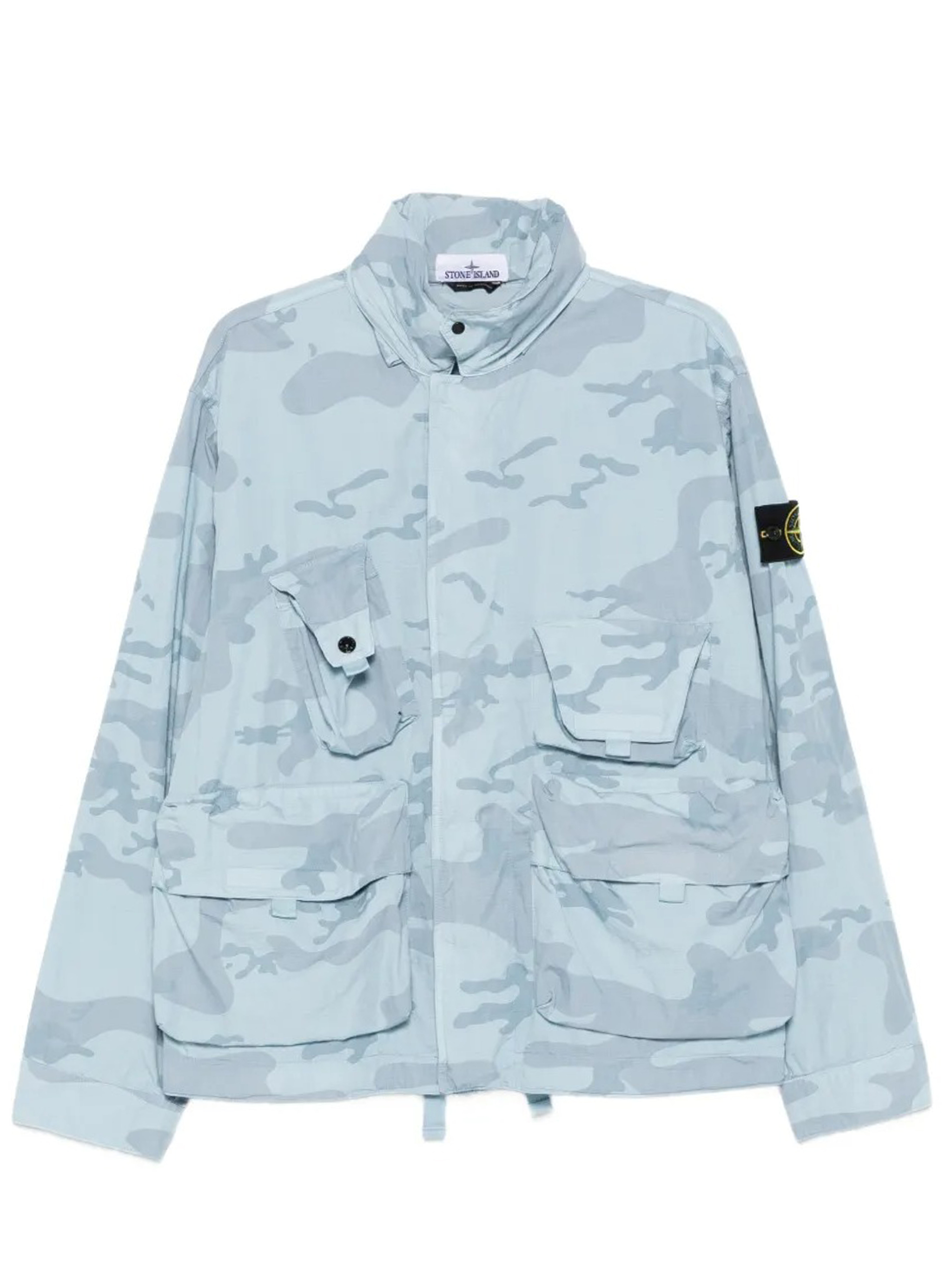 Stone Island blue cotton jacket with long sleeves, camouflage pattern, hidden front closure, and logo patch.