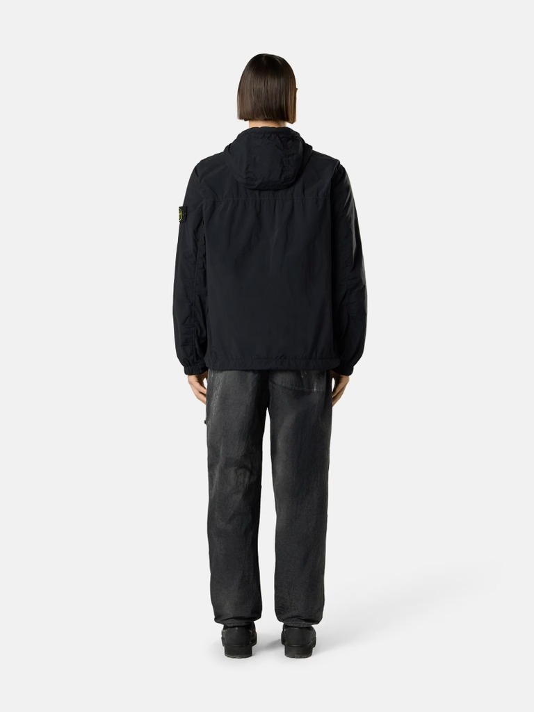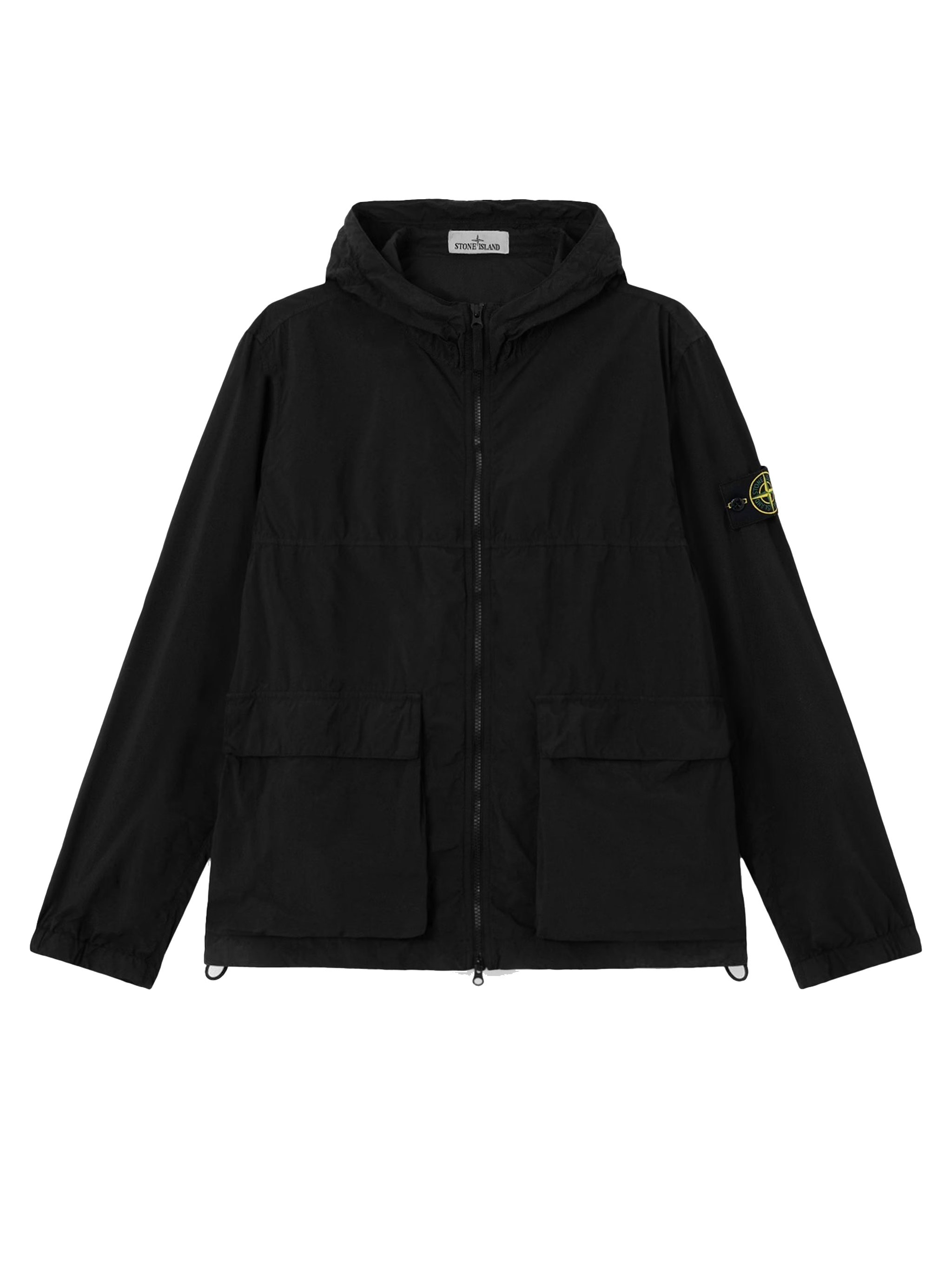 Black Stone Island jacket in polyamide with double-slider zip closure, side pockets, flap, badge, and straight hem.